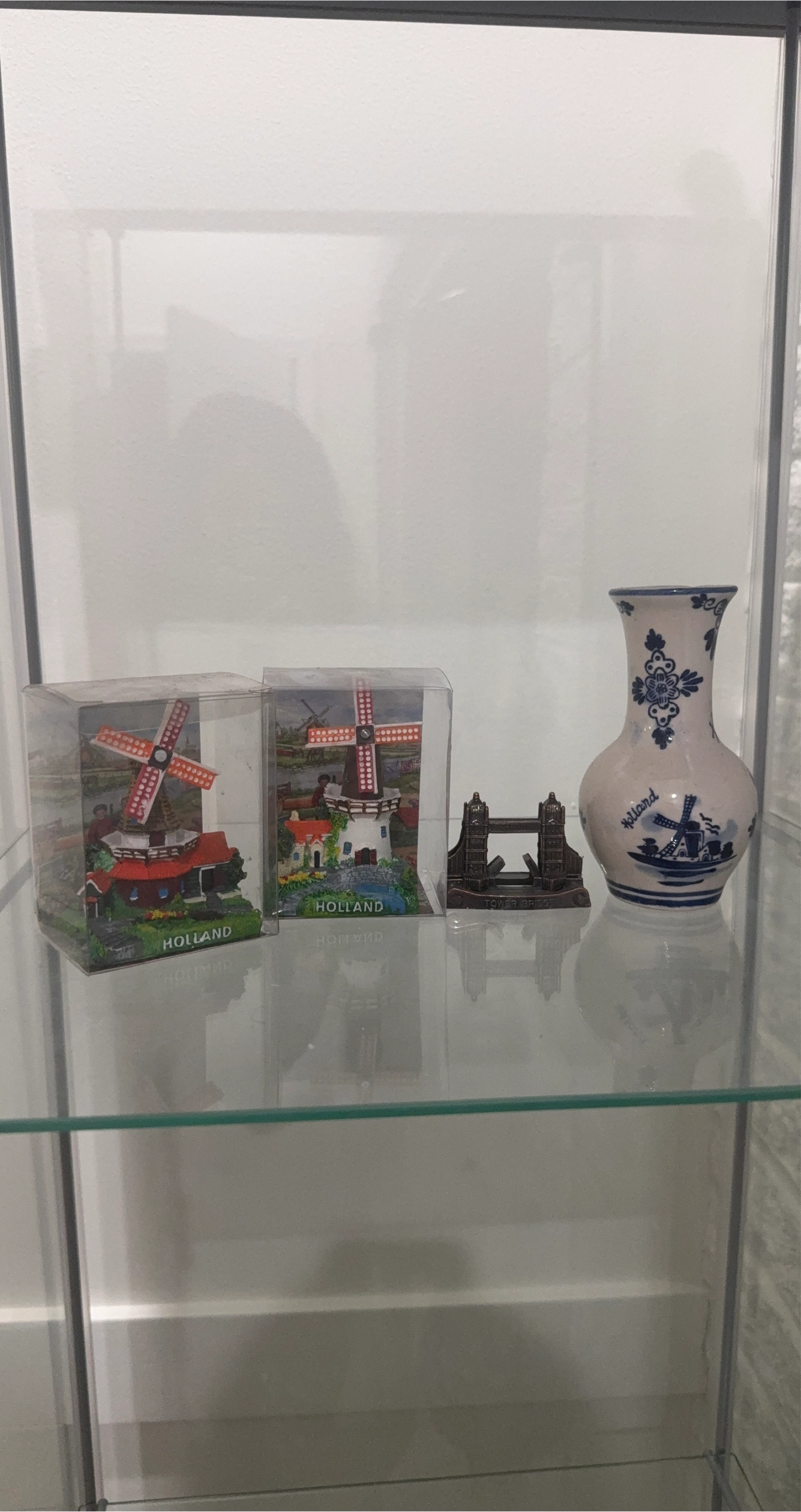 Selling a set of Holland-themed souvenirs! Includes a windmill in a box, a small Tower Bridge replica, and a Delft-style vase with a windmill design. Perfect for collectors or as a reminder of your travels!