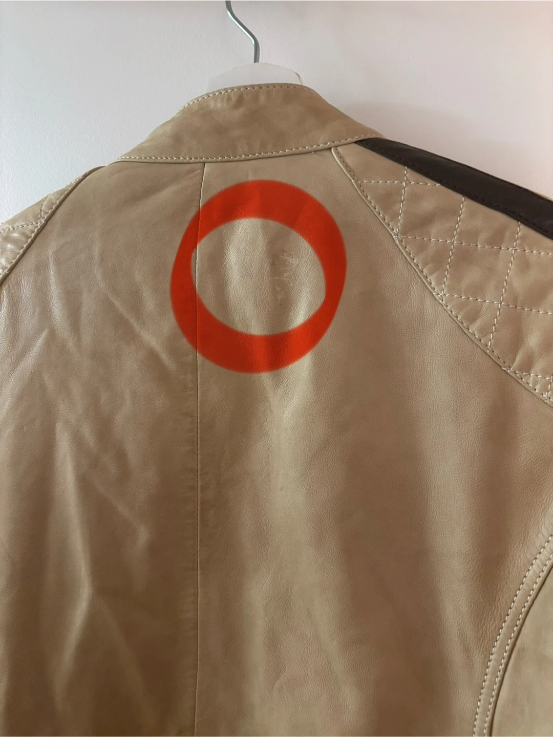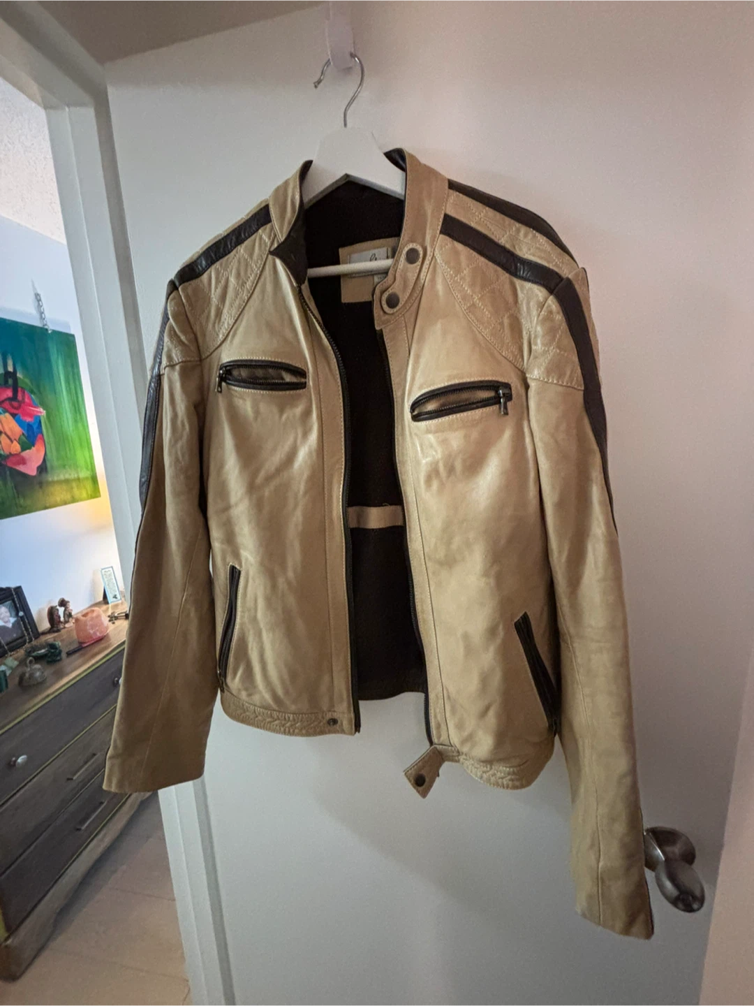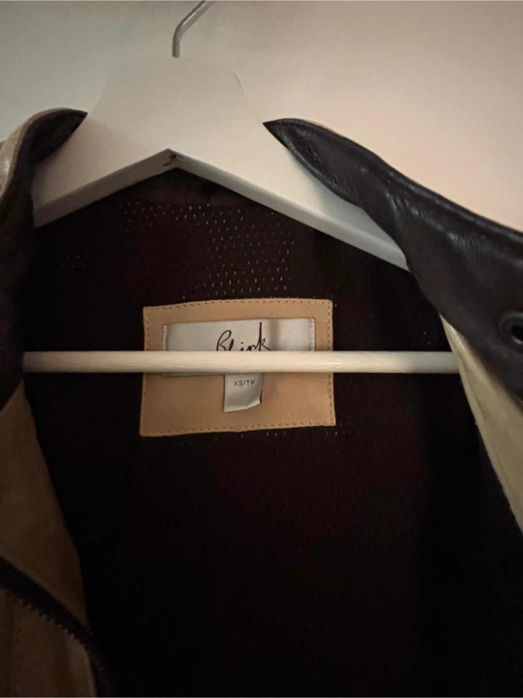 Selling a Danier-Blink leather jacket in size XS/TP. This stylish biker jacket features a unique design and is made from genuine leather. The jacket is in good condition with one minor wear mark on the back (see photo 4) and ready for a new home!