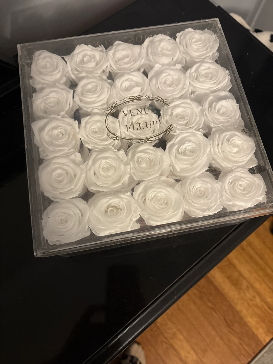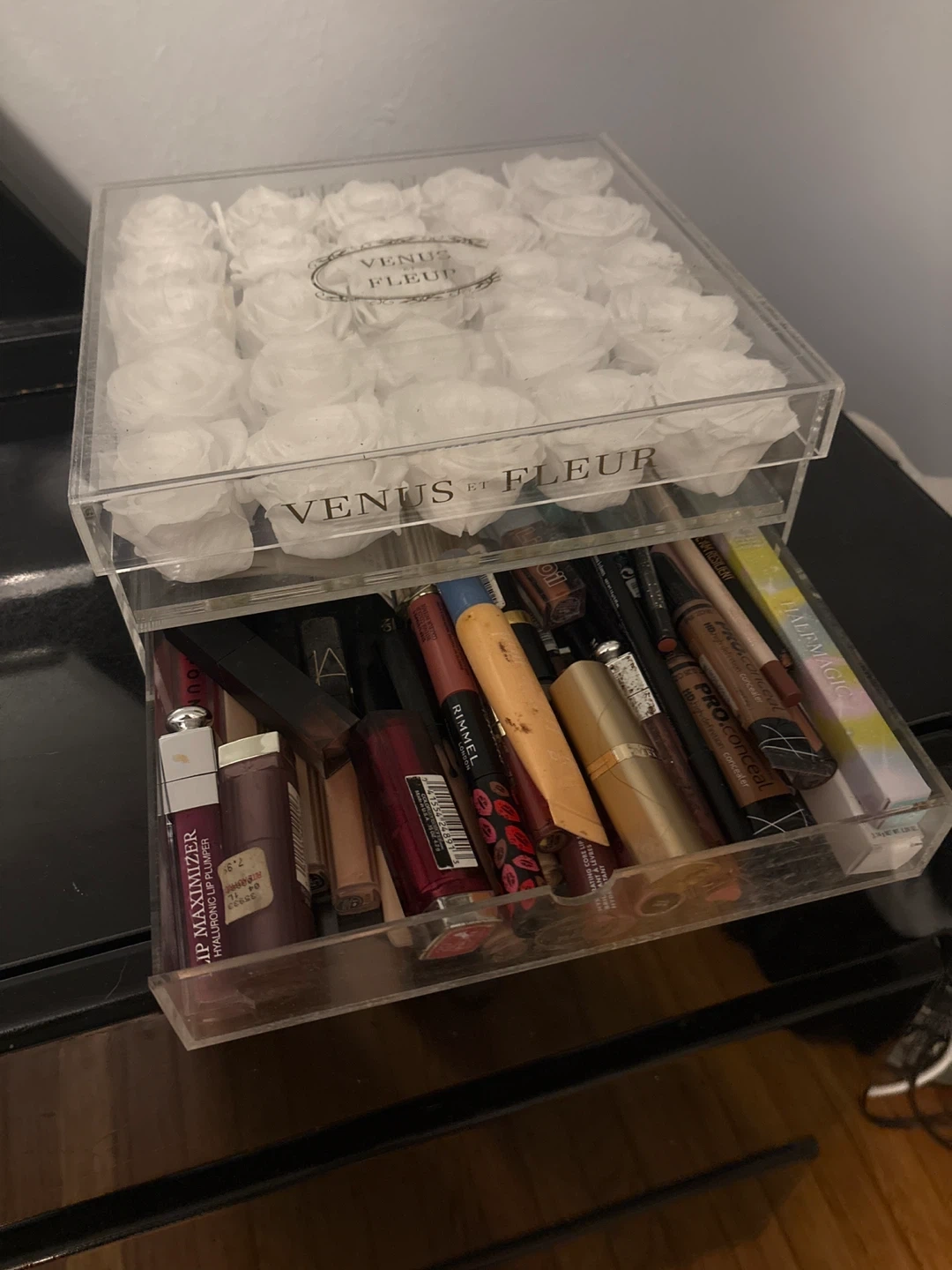 Selling a Venus Et Fleur acrylic makeup organizer! It's perfect for keeping your beauty products tidy and looking elegant. The clear design lets you easily see all your items, and the rose-themed lid adds a touch of luxury to your vanity or dresser