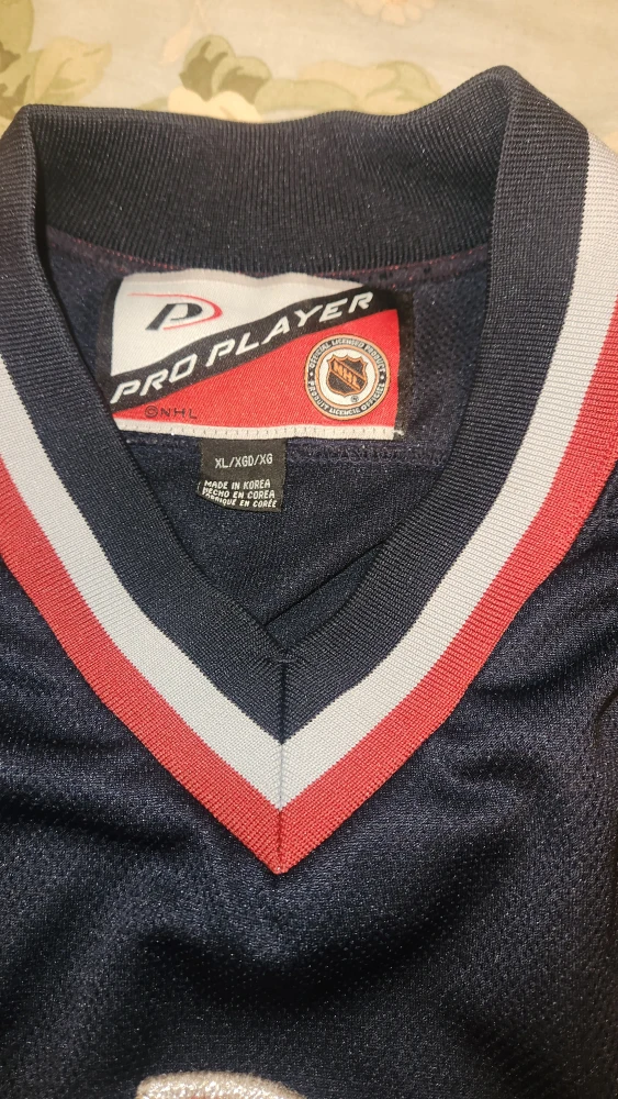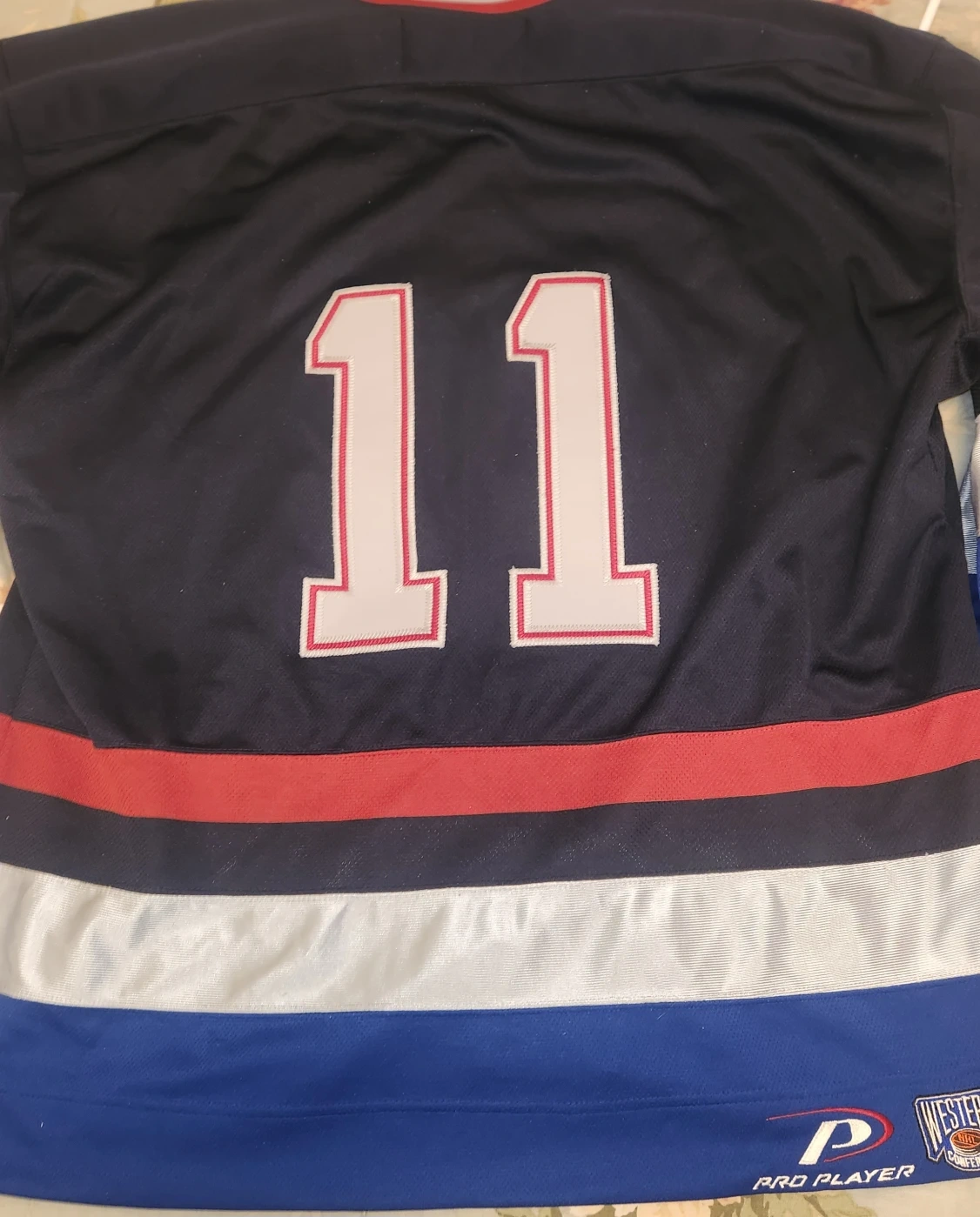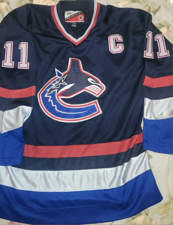 Selling a Vancouver Canucks hockey jersey by Pro Player. It's a size XL/XG/6G. The jersey is navy blue, red, silver and white with the Canucks logo on the front and the number 11 on the sleeves and back. It also has the captain's 'C' on the front. Mark Messier 1997 .