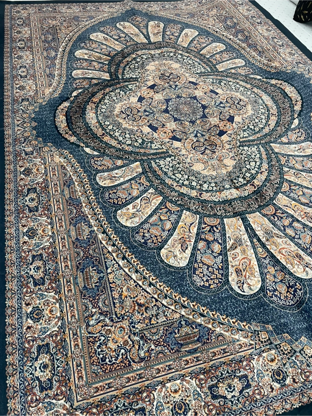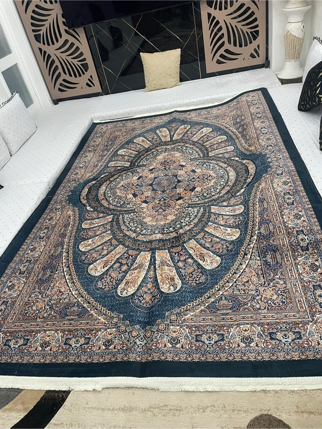 This is a beautiful area rug with an intricate pattern in shades of blue, beige, and brown. It would be a great addition to any room!
