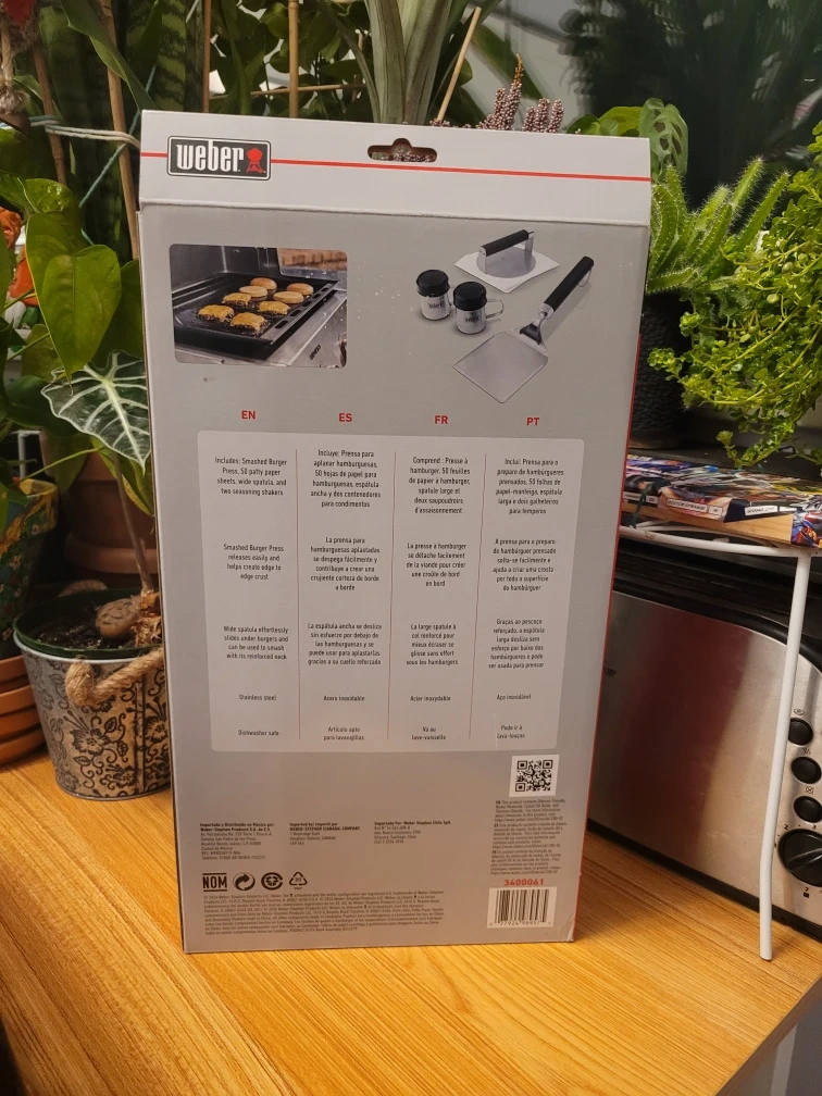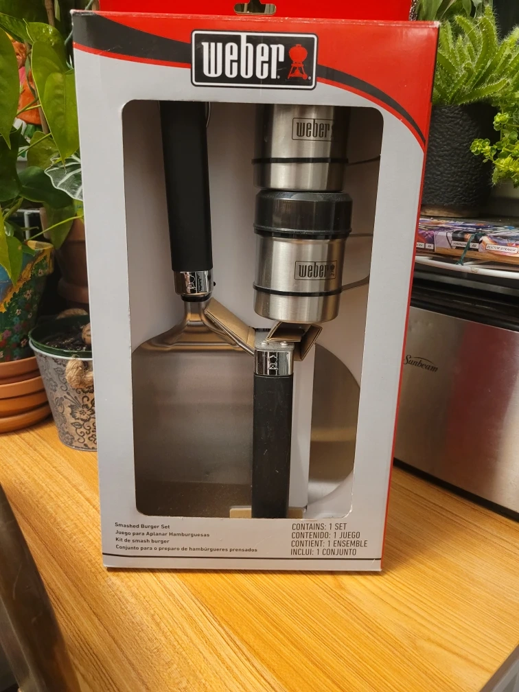I'm selling a brand new Weber Smashed Burger Press Kit, still in its original box! It includes everything you need to make delicious smashed burgers at home. The kit contains a burger press, two seasoning shakers, and a spatula. All the tools are stainless steel and dishwasher safe for easy cleanup!