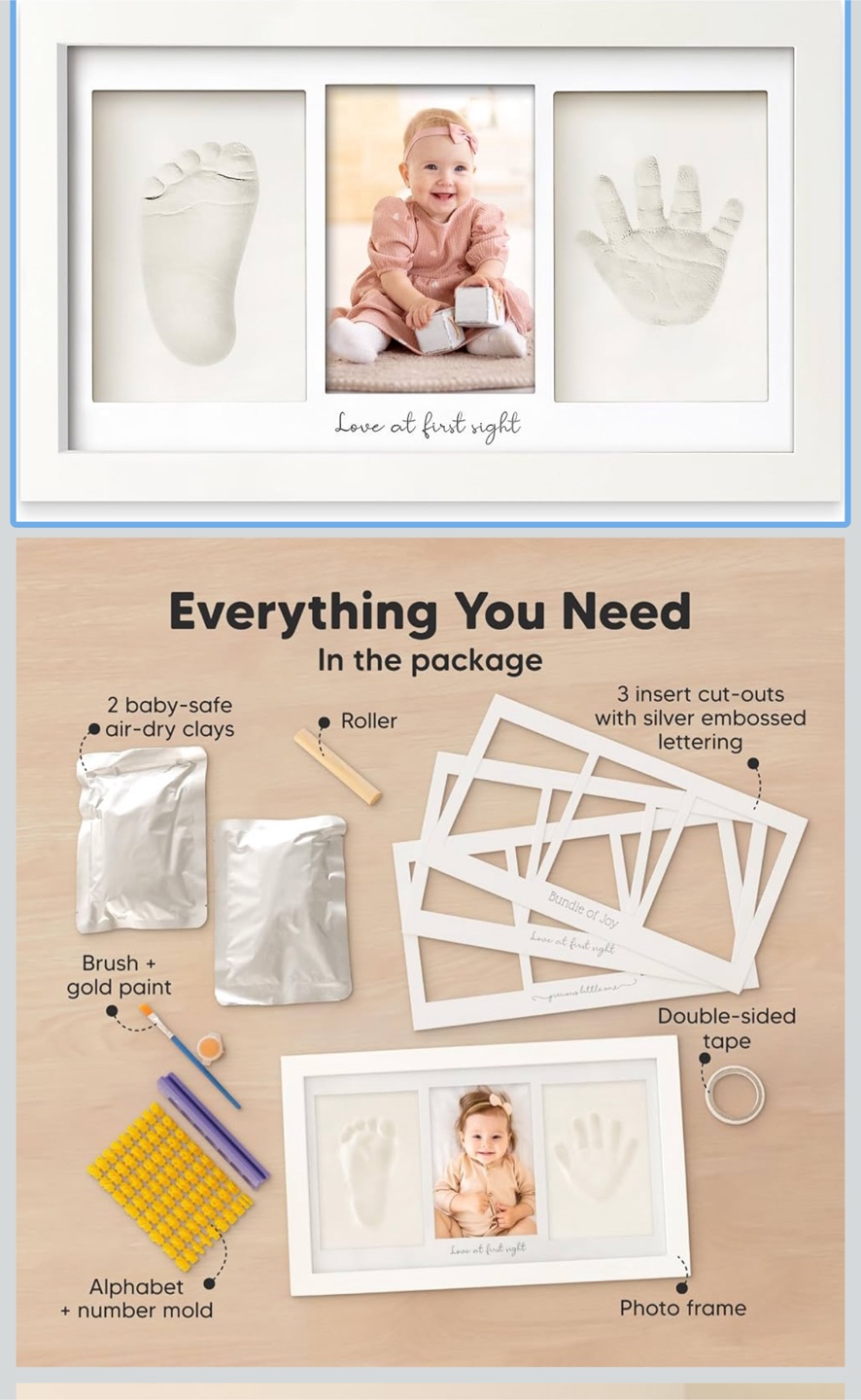 Capture those tiny hands and feet with the KeaBabies Duo Baby Handprint & Footprint Keepsake Frame! This kit includes everything you need to create a lasting memory: 2 baby-safe air-dry clays, a roller, 3 insert cut-outs with silver embossed lettering, a brush with gold paint, an alphabet and number mold, and double-sided tape. The keepsake frame is also included, making it a complete package to cherish those precious moments