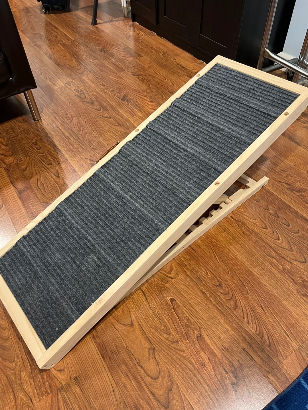 Selling a brand new pet ramp in perfect condition! It's adjustable to different heights to help your furry friend get to those hard-to-reach places. Made with a sturdy wooden frame and a non-slip carpet surface for added safety and comfort. Never used - originally purchased as a gift