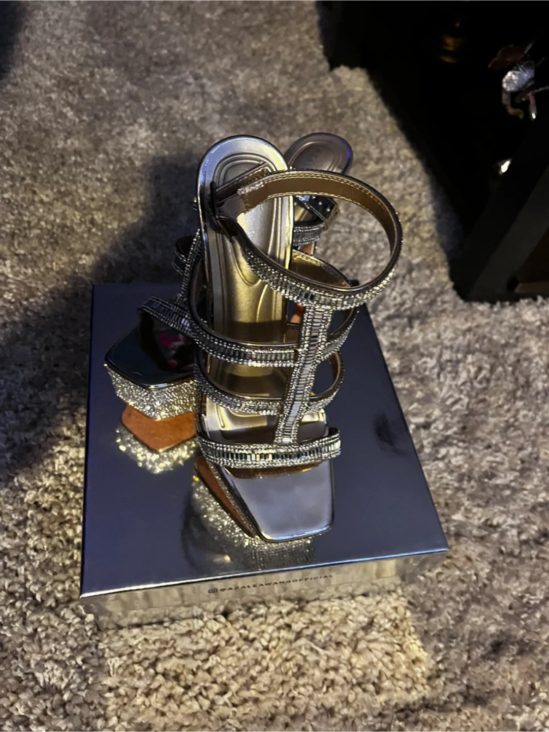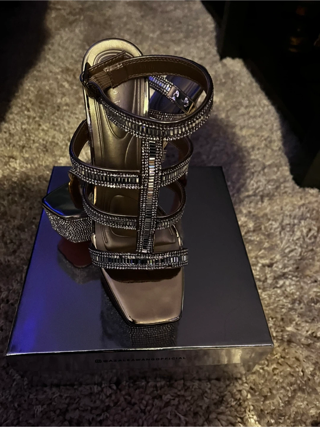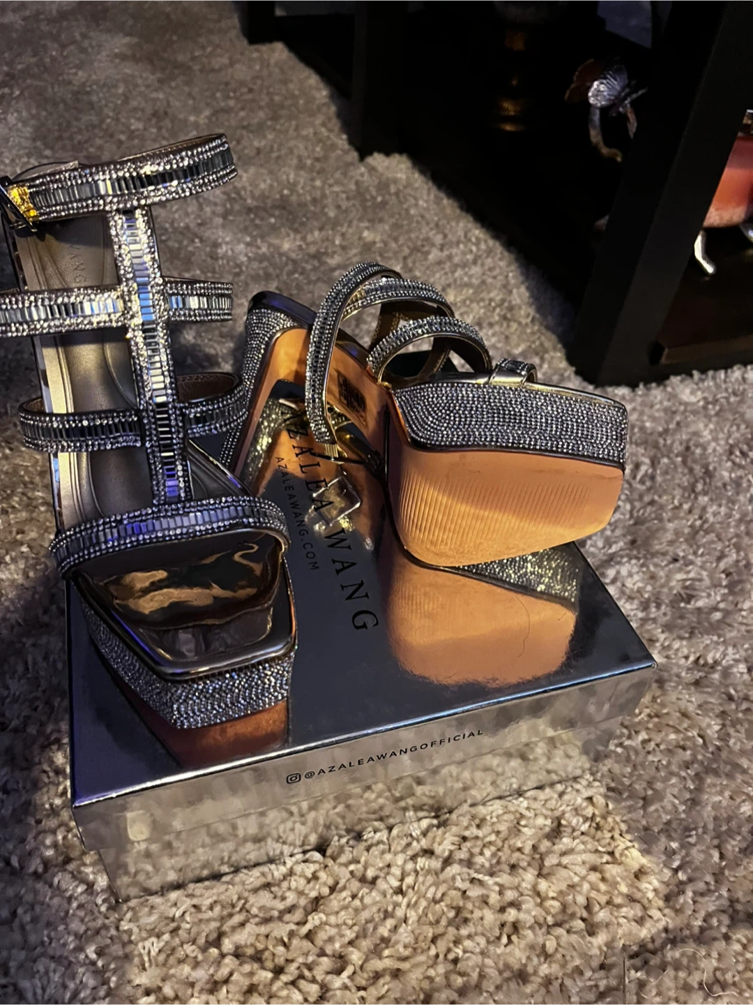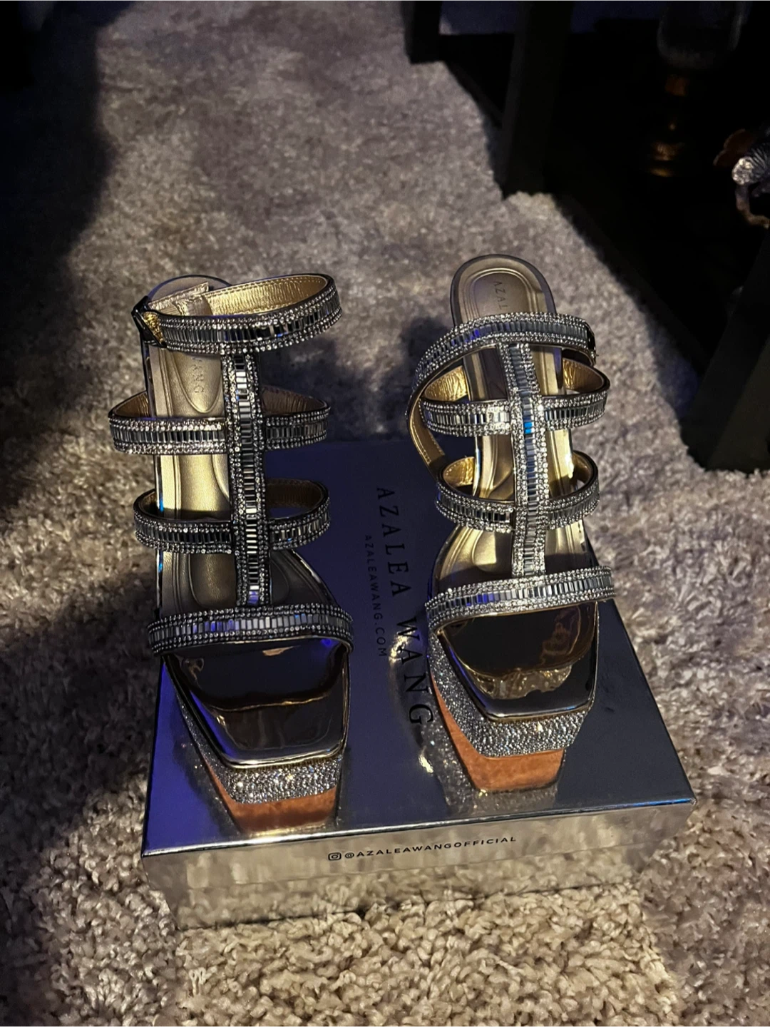 These Azalea Wang heels are sure to make a statement! They feature a unique design with rhinestone embellishments. Comes with the original box!