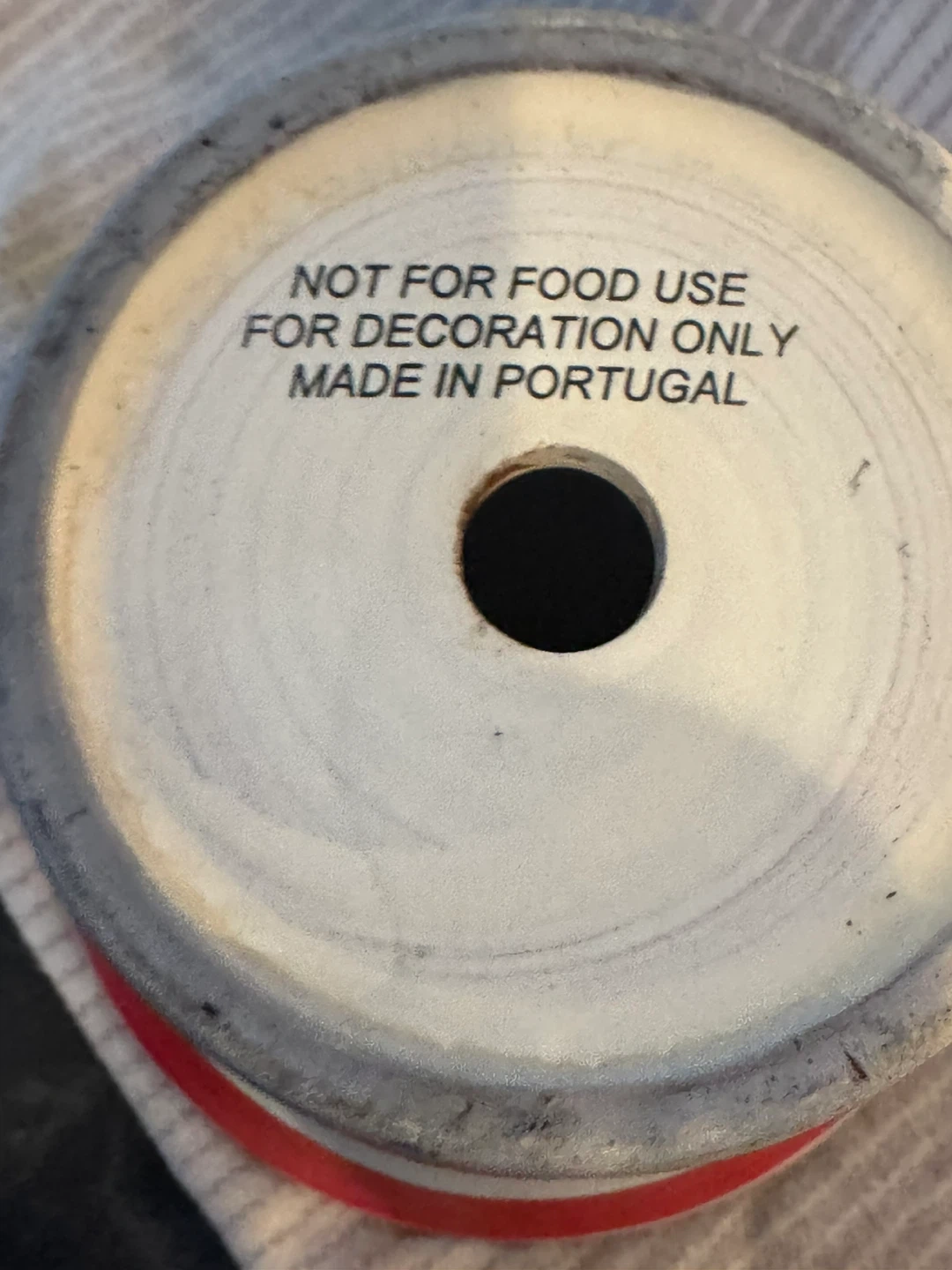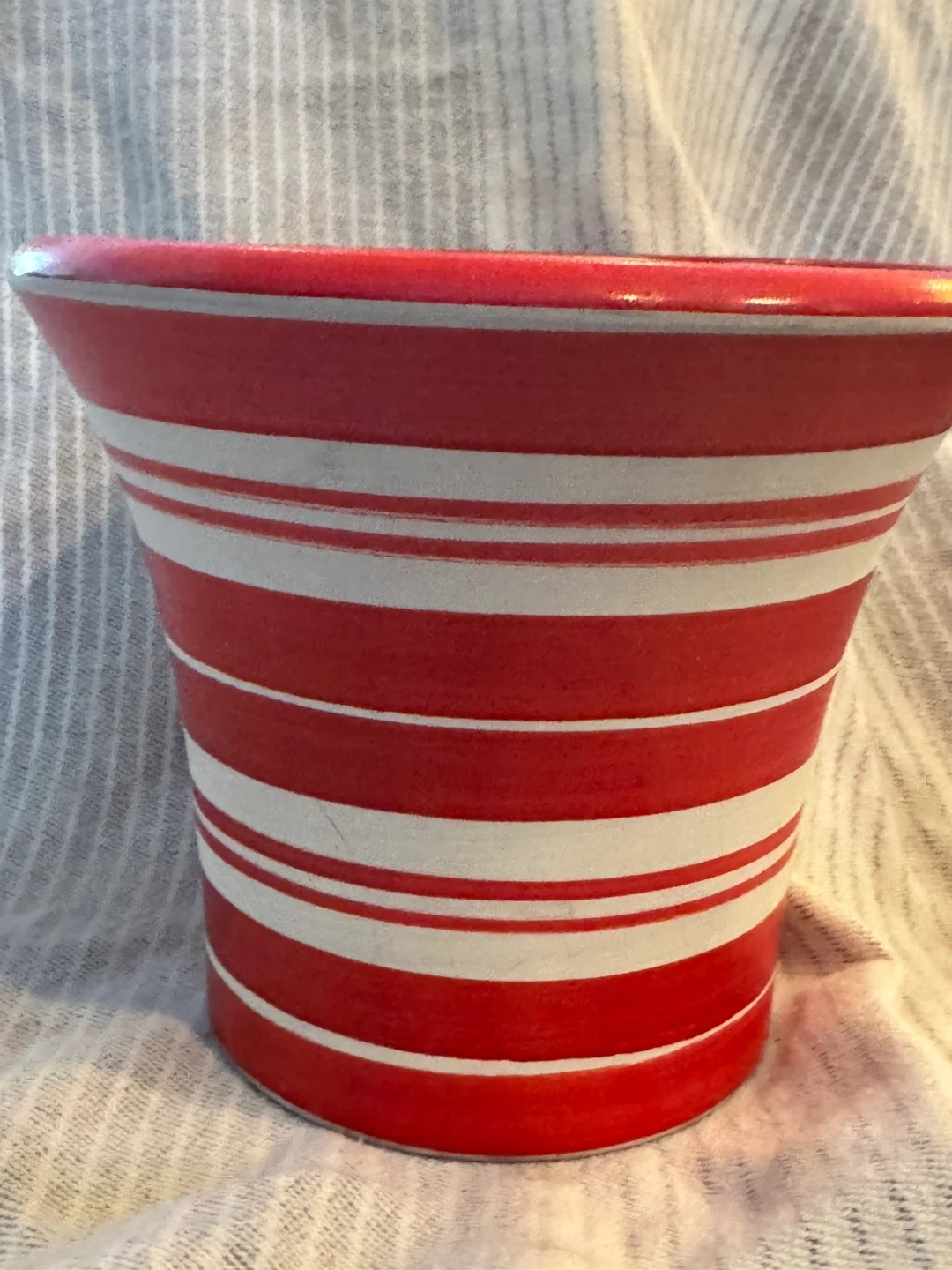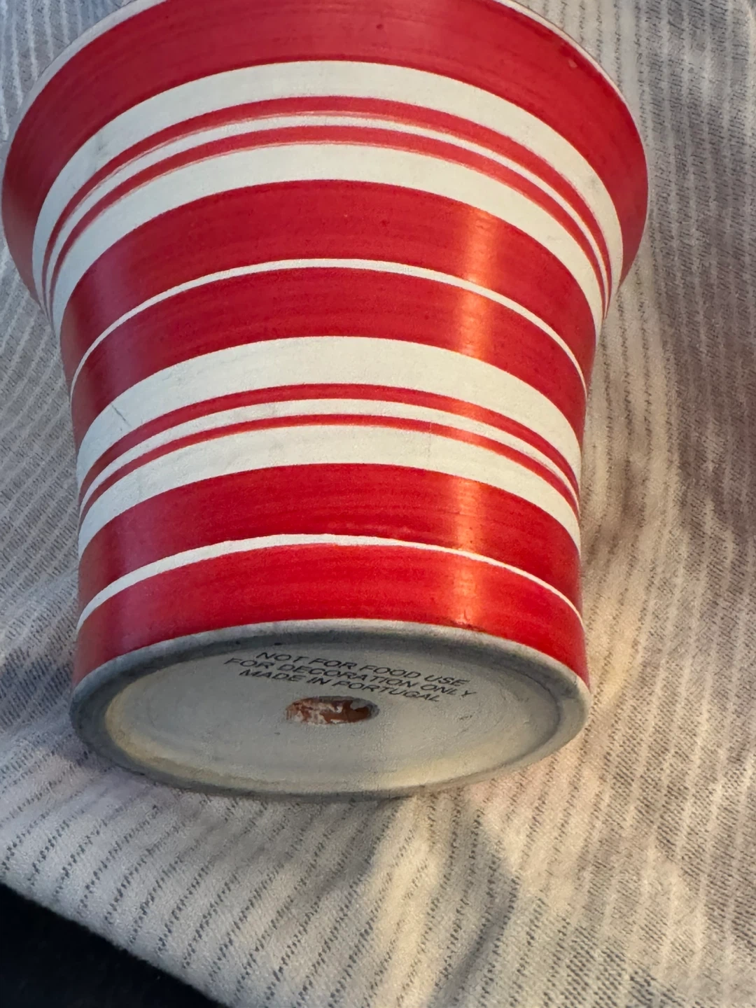 This decorative pot features a vibrant red and white striped design. It's perfect for adding a pop of color to your home decor. Please note it's made for decoration only and not for food use.