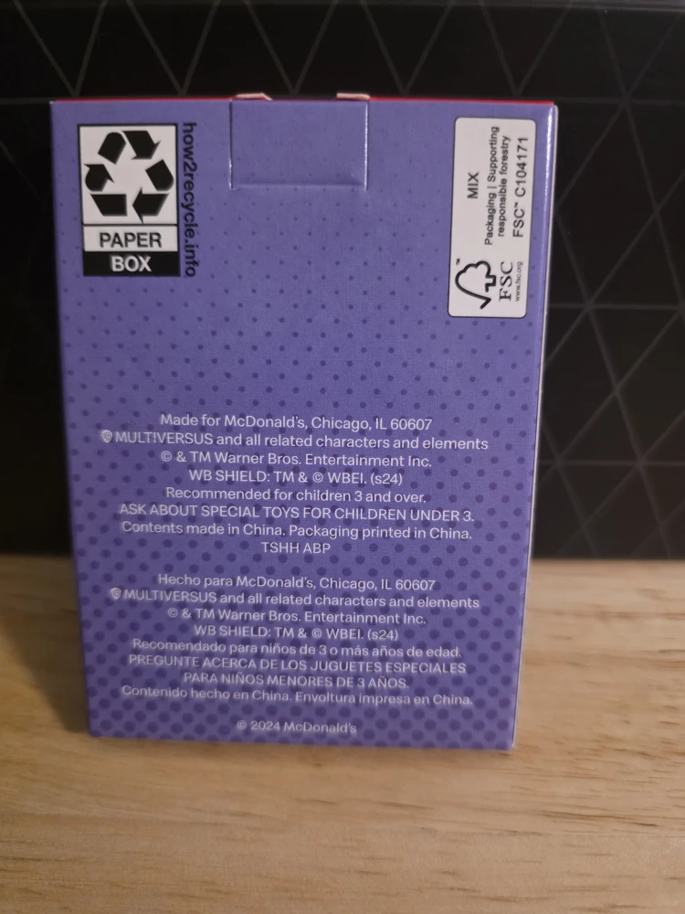 Selling a MultiVersus Shaggy/Batman toy from McDonald's! It's recommended for children ages 3 and up. The packaging is made in China and printed in China. © 2024 McDonald's