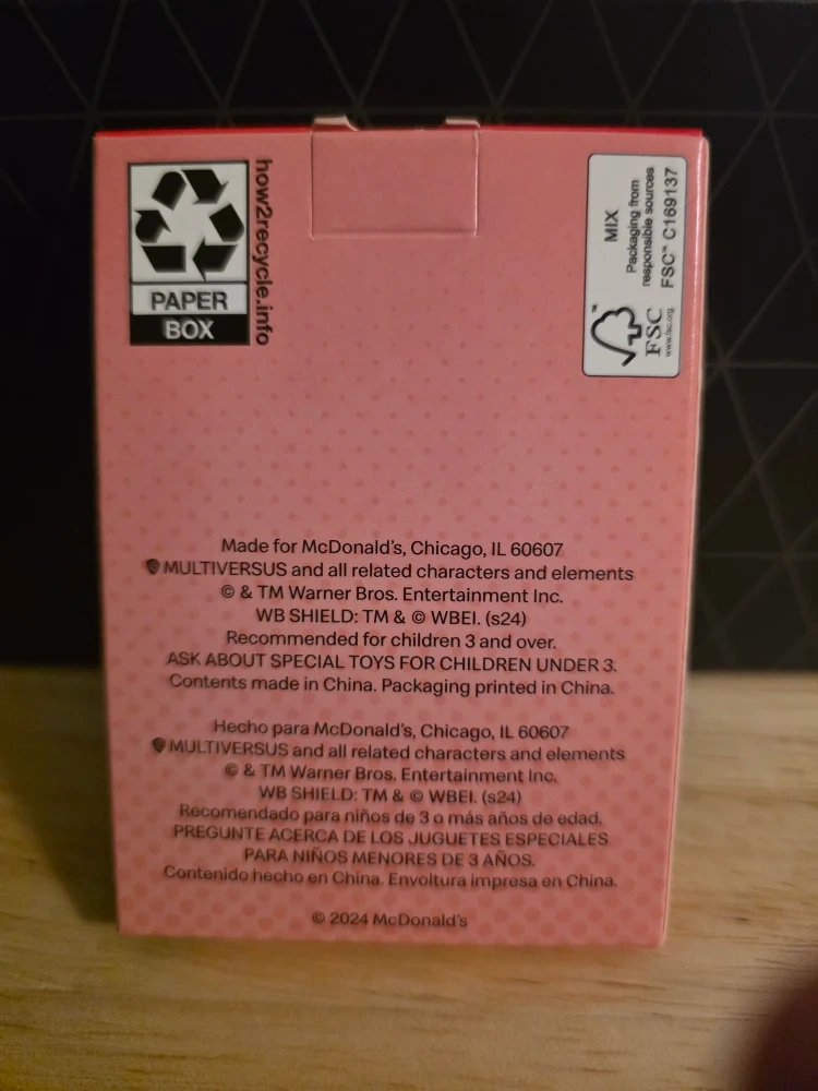 I'm selling a McDonald's Multiversus toy featuring Velma and Superman. Recommended for children 3 and over. The contents are made in China, and the packaging is printed in China. © 2024 McDonald's