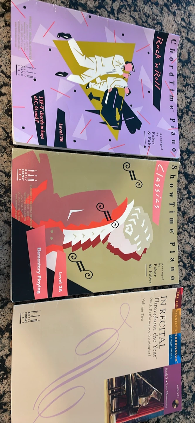 Selling a set of Faber & Faber piano books. Includes ChordTime Piano Rock 'n Roll Level 2B, Showtime Piano Classics Level 2A, and In Recital Throughout the Year Volume Two Book 3. Great for beginner piano students