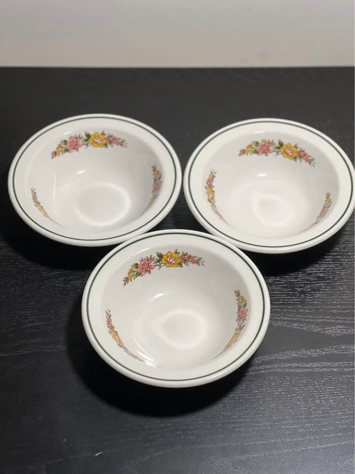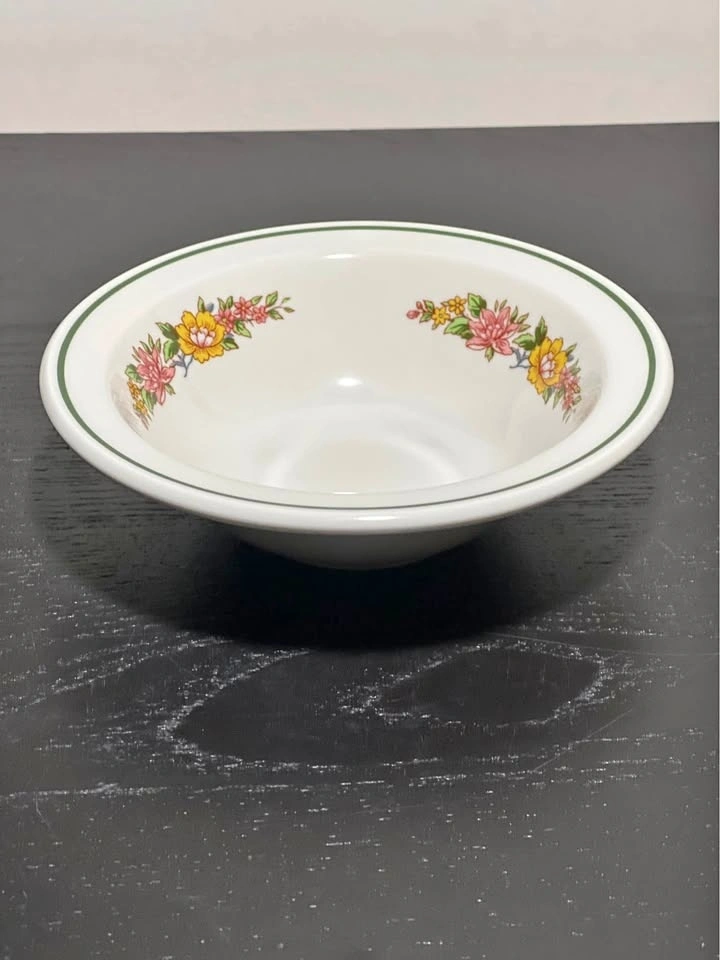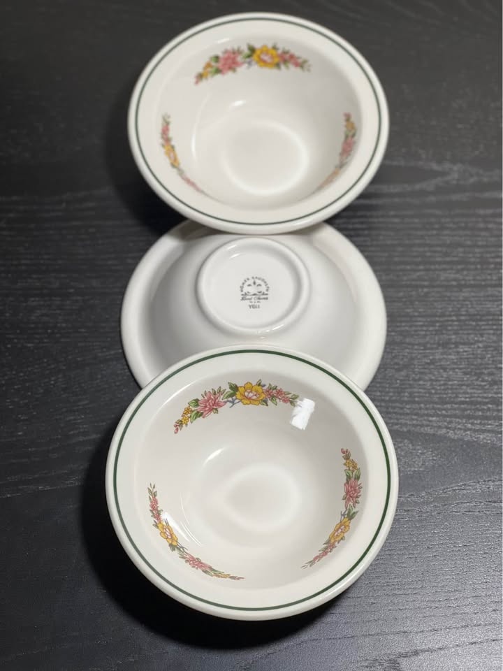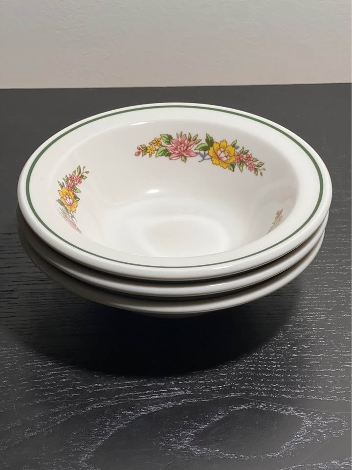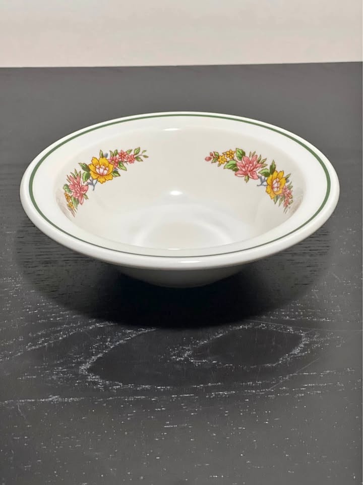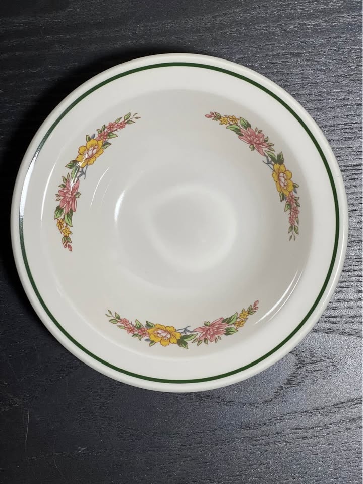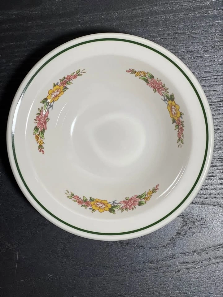 These are restaurant-ware bowls featuring a green stripe border and a floral design with yellow and pink flowers.