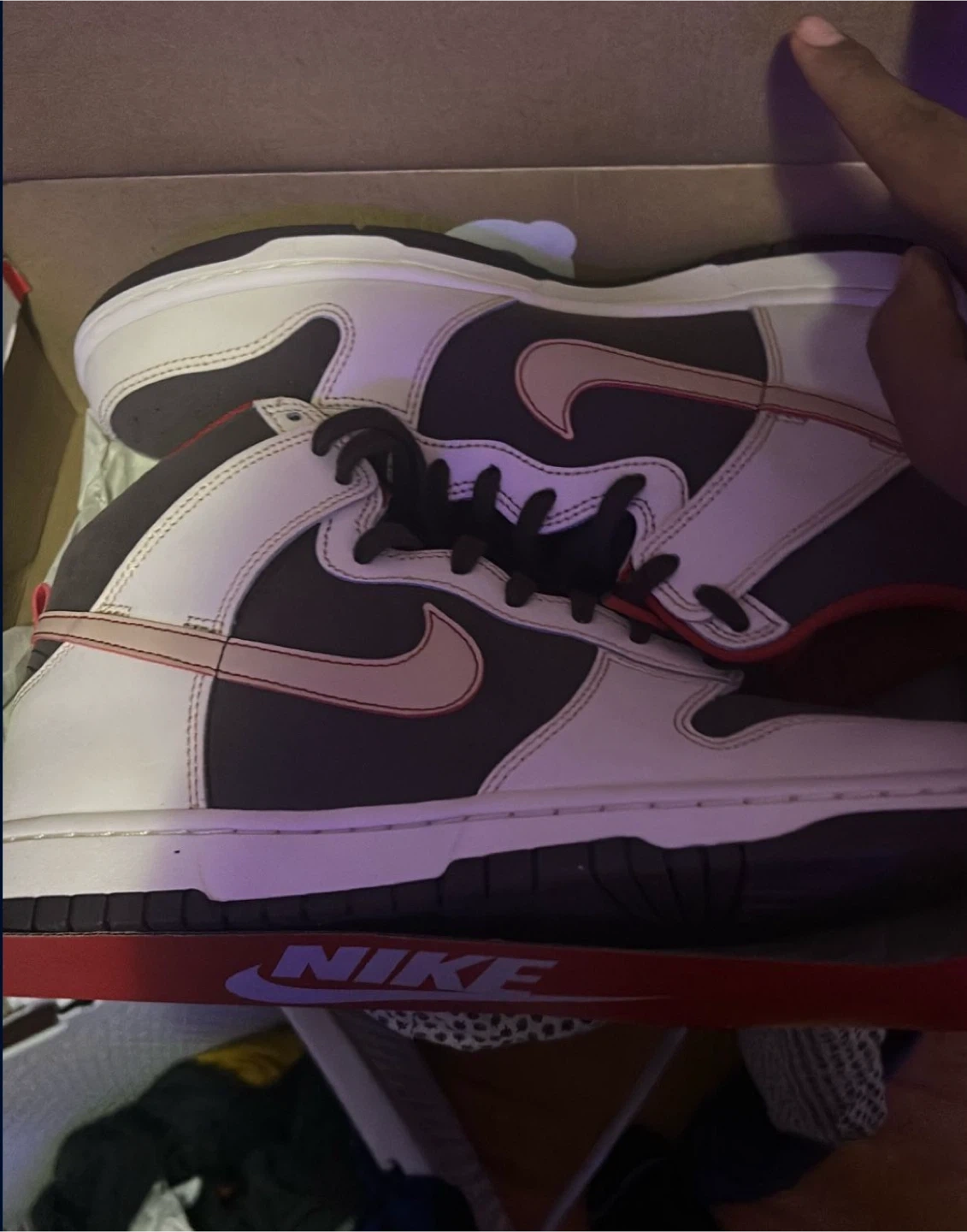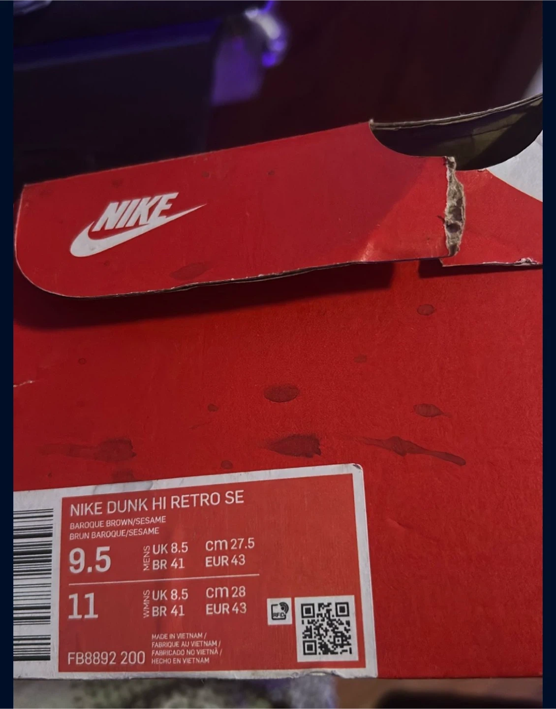 Selling a pair of Nike Dunk Hi Retro SE sneakers in the Baroque Brown/Sesame colorway. The size is 9.5 US men's. They come with the original box