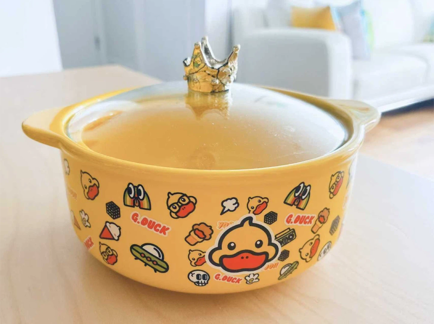 Here's a cute yellow ceramic cookware pot featuring the G.Duck character! It comes with a lid and is perfect for cooking up your favourite dishes. The pot is in great condition and ready for a new home