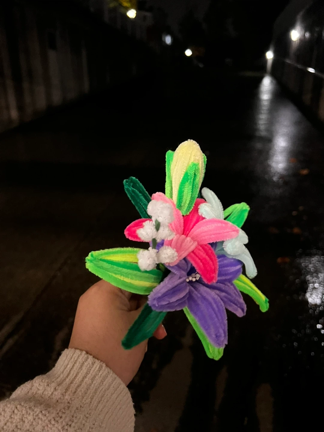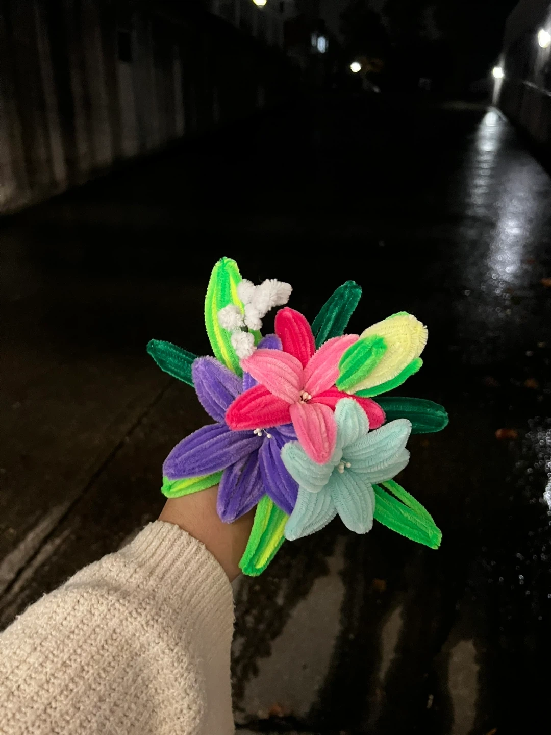 Selling a colourful handmade flower bouquet made from pipe cleaners! This unique and vibrant bouquet is perfect for adding a touch of whimsy to any space. Best for gifting on special occasions. It's a fun and creative alternative to traditional flowers, and it's sure to brighten someone's day!