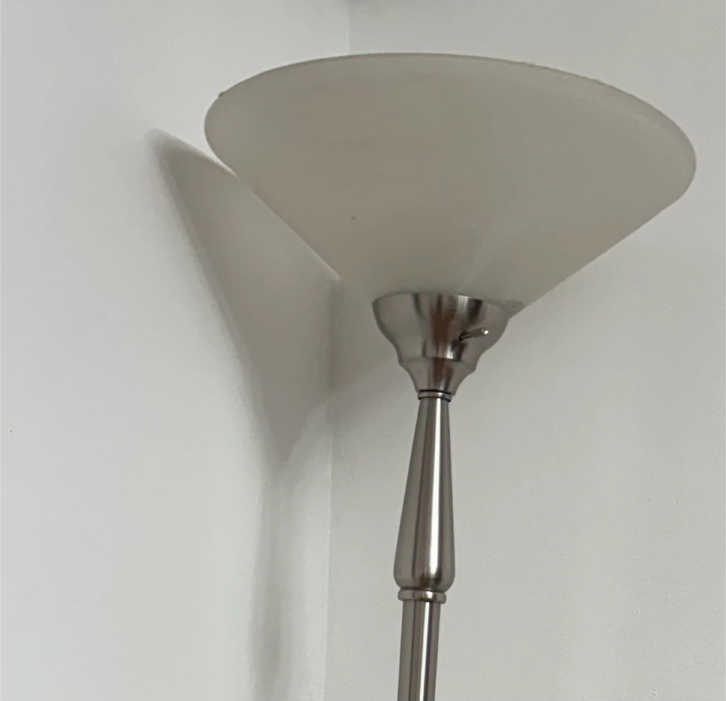 Selling a standing floor lamp with a silver finish. It has a nice frosted glass shade. It's in great condition and would look lovely in any room