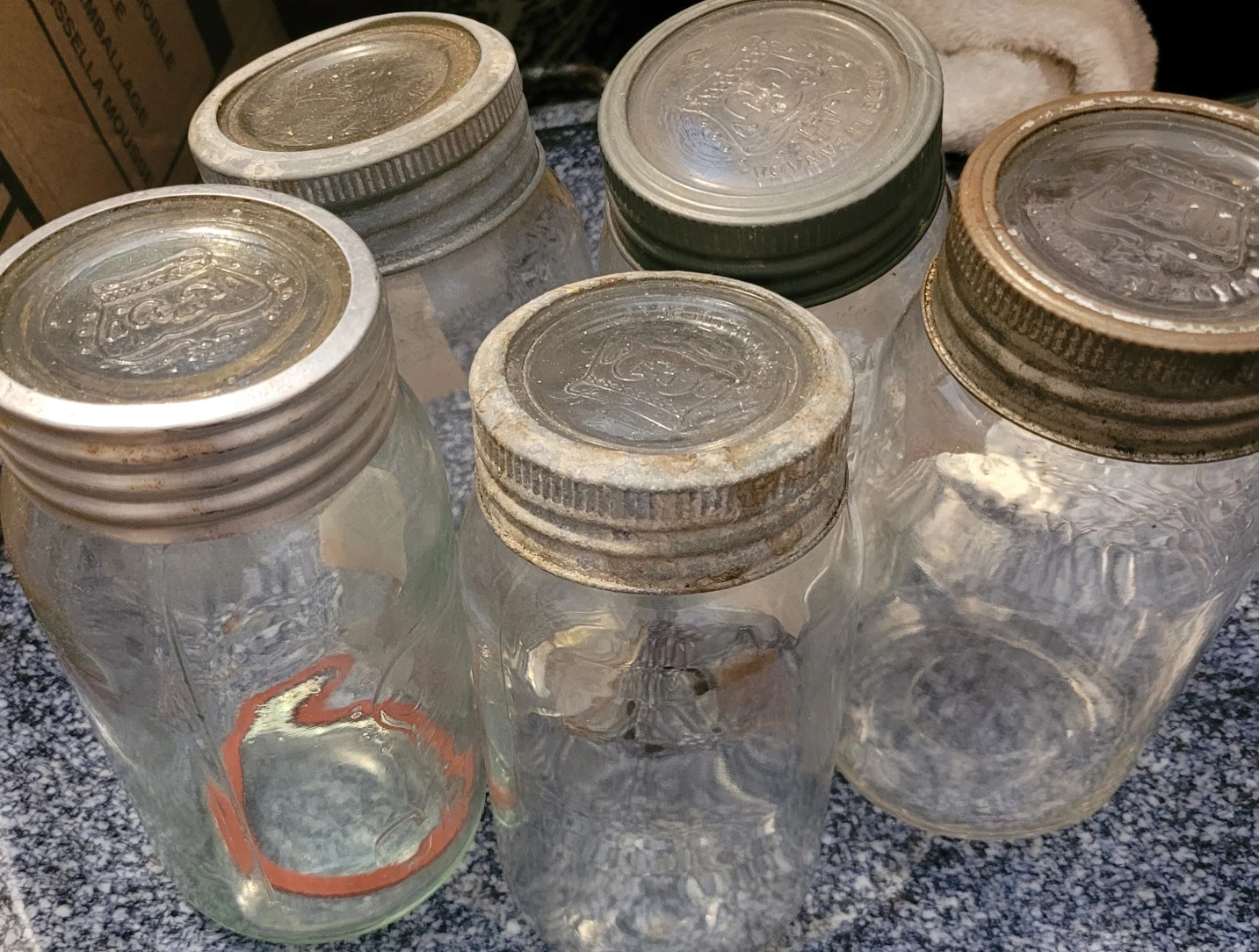 Selling a set of 5 vintage glass mason jars. They have a classic look and are perfect for canning, storage, or decor. The lids have a rustic, aged appearance, adding to their charm. Great for anyone looking for that vintage touch!