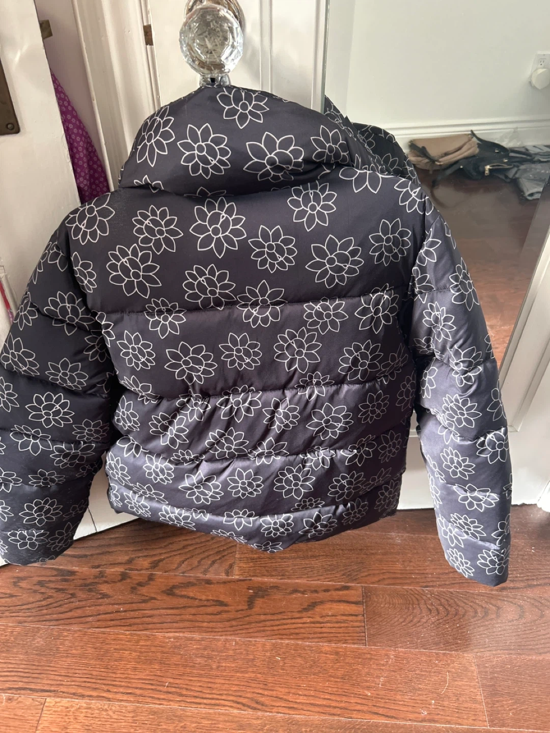 Selling an Unreal Fur puffer jacket in size small. It's a stylish and cozy jacket with a unique floral pattern. Perfect for staying warm and fashionable!