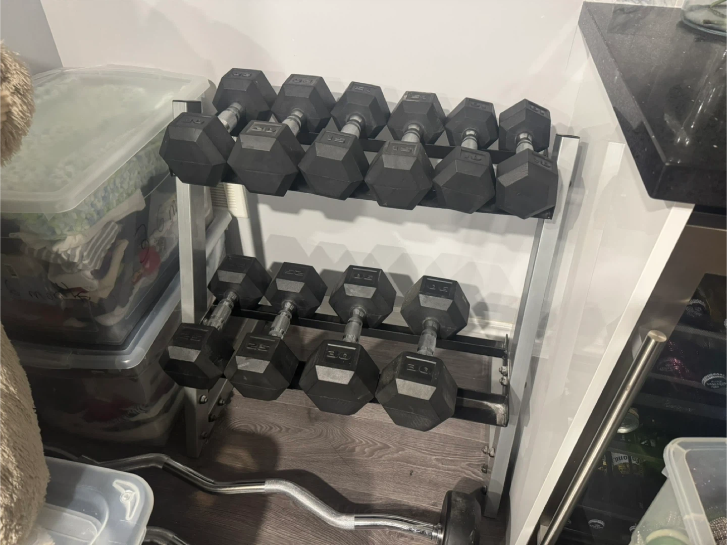 Selling a set of hex dumbbells with a rack. Includes pairs of 10lb, 15lb, 20lb, 25lb, and 30lb dumbbells. Great for a home gym!