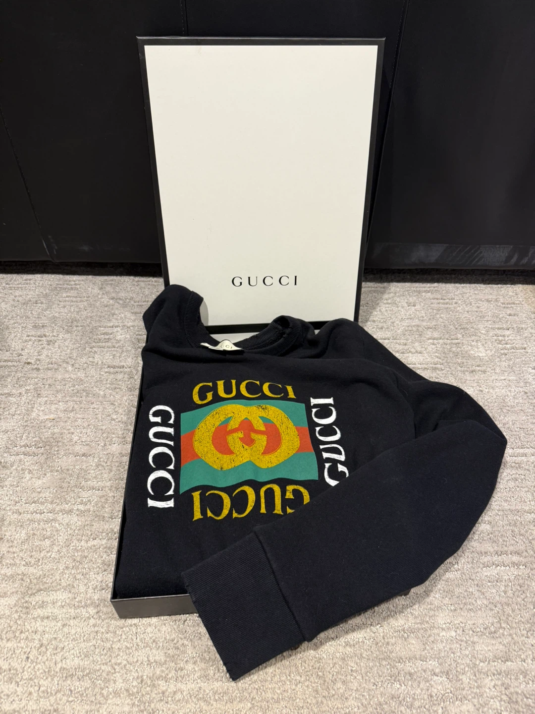 Selling a stylish Gucci sweatshirt made in Italy! It's a size small and features a cool Gucci logo design. The sweatshirt is black and made of cotton. Comes with the original box!