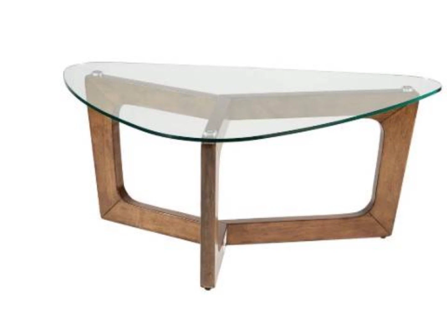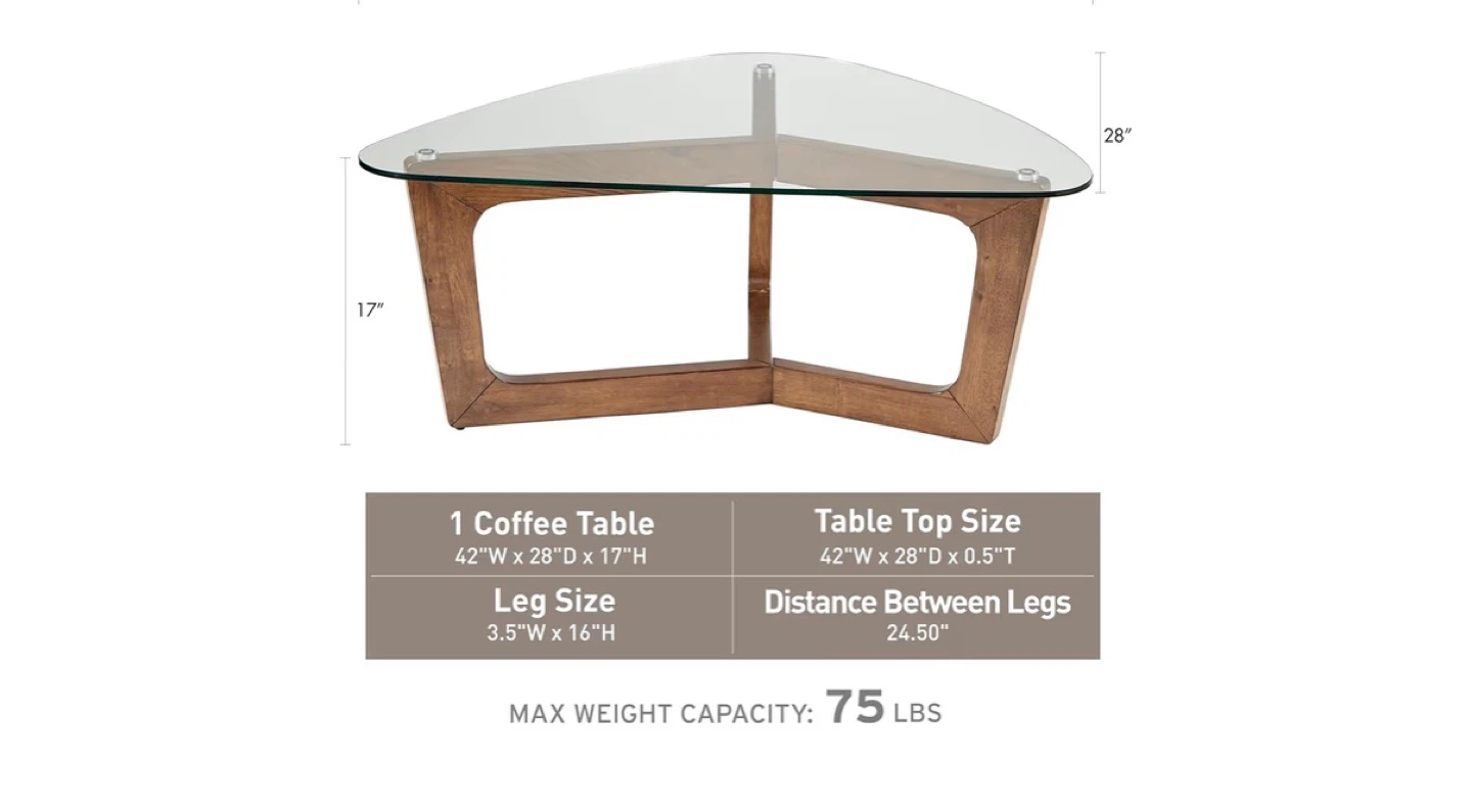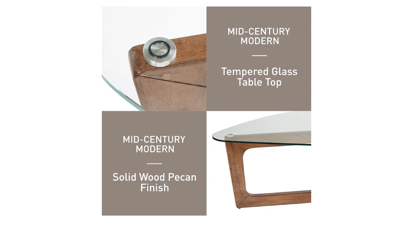 Selling a stylish mid-century modern coffee table! It features a tempered glass table top and a solid wood pecan finish. The table dimensions are 42"W x 28"D x 17"H. It can hold a max weight capacity of 75 lbs. Comes with the original box!