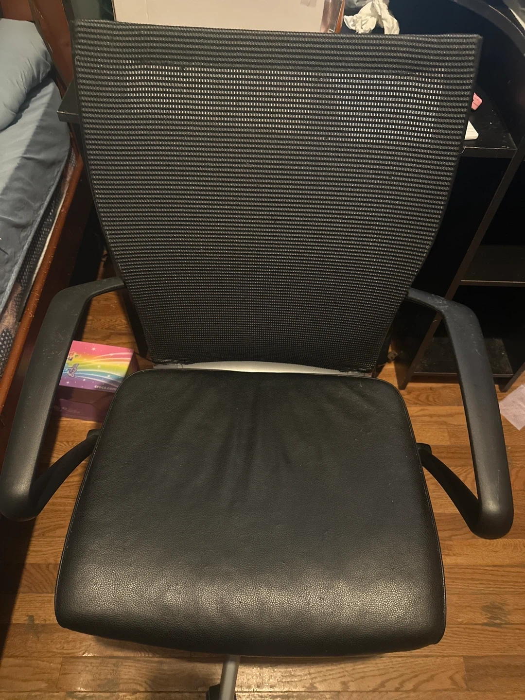 Selling a comfortable black mesh office chair. It's in good condition and ready for a new home! Perfect for your home office or study space. The chair features a mesh back for breathability and a padded seat for comfort. The armrests provide additional support during long work sessions