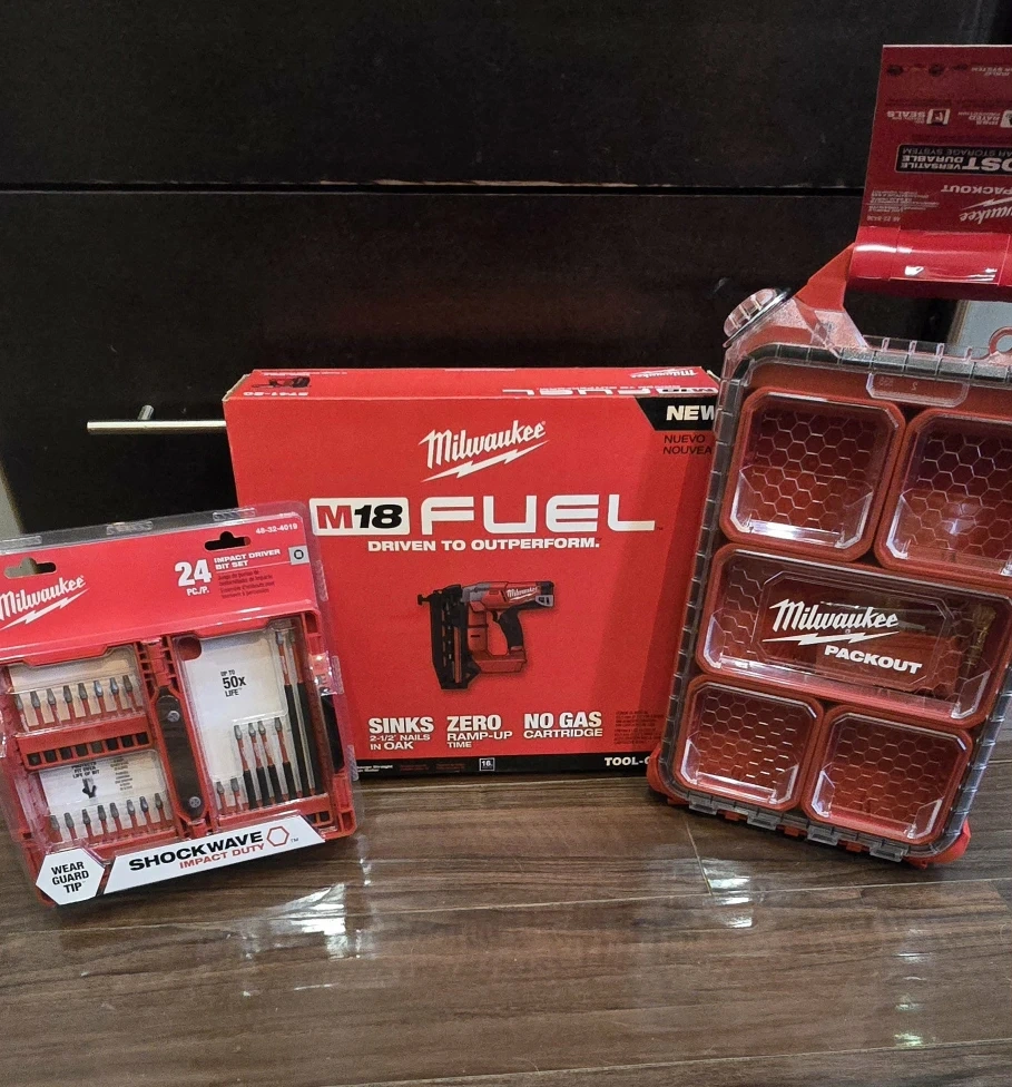 Selling a brand new Milwaukee M18 FUEL nailer, along with a 24-piece impact driver bit set and a PACKOUT modular storage system. All items are in new condition and ready for your next project!