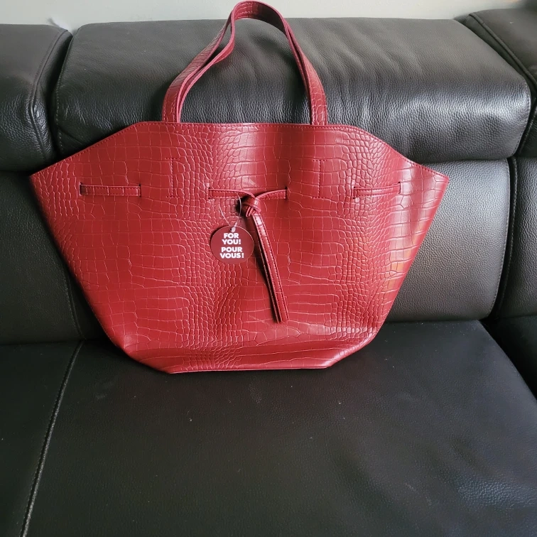 Check out this stylish burgundy tote bag! It features a faux crocodile skin texture and is brand new with tags. Perfect for adding a pop of colour to your outfit