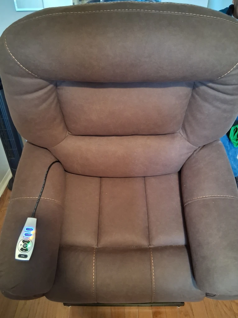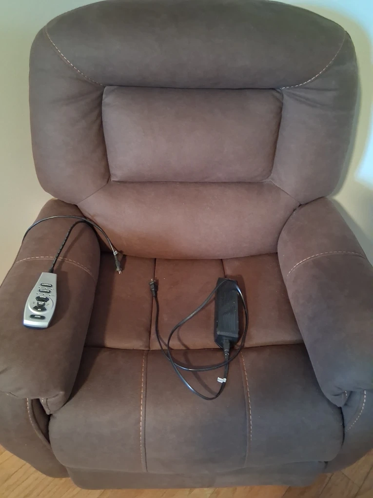 I'm selling a comfortable brown electric recliner. It's like new and includes a remote control to adjust the temperature, massage, and intensity. It's perfect for relaxing after a long day.