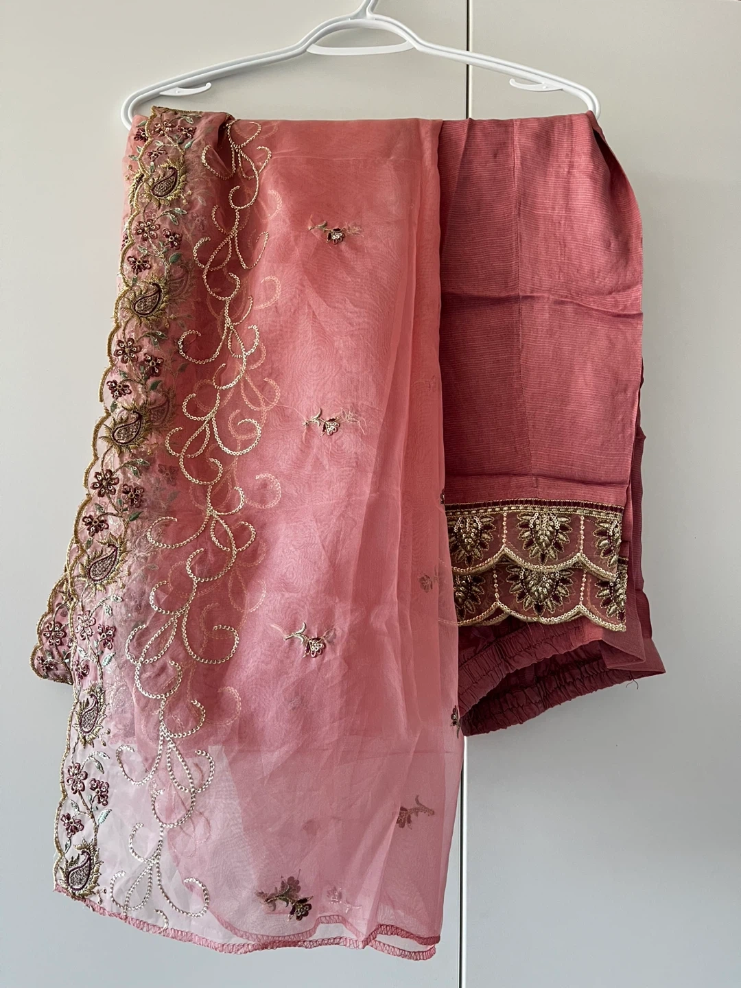 Beautiful salwar kameez suit with intricate embroidery. The set includes a kameez (tunic), salwar (pants), and dupatta (scarf). The colour is a lovely shade of pink. Perfect for special occasions!