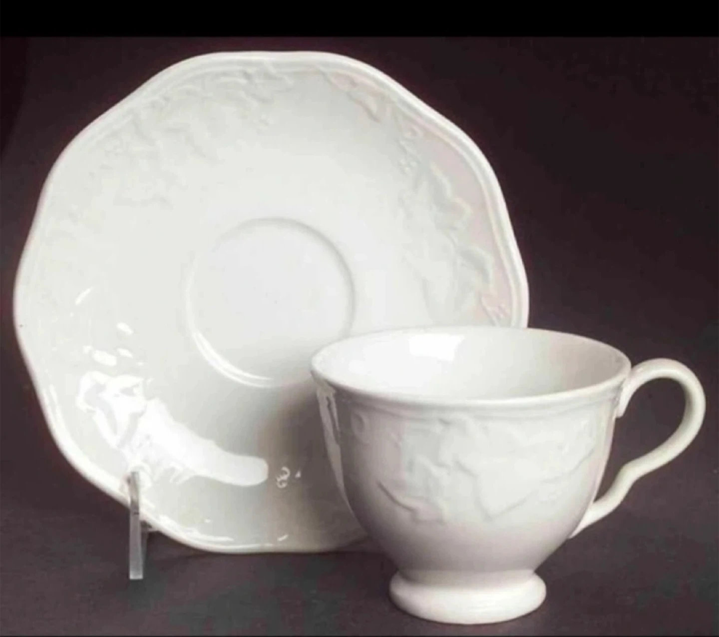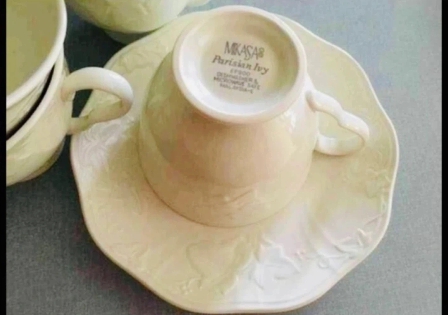 12 cups and 12 saucers in the Mikasa Parisian Ivy pattern. Most pieces have never been used. Larger, generous sized bone china cups