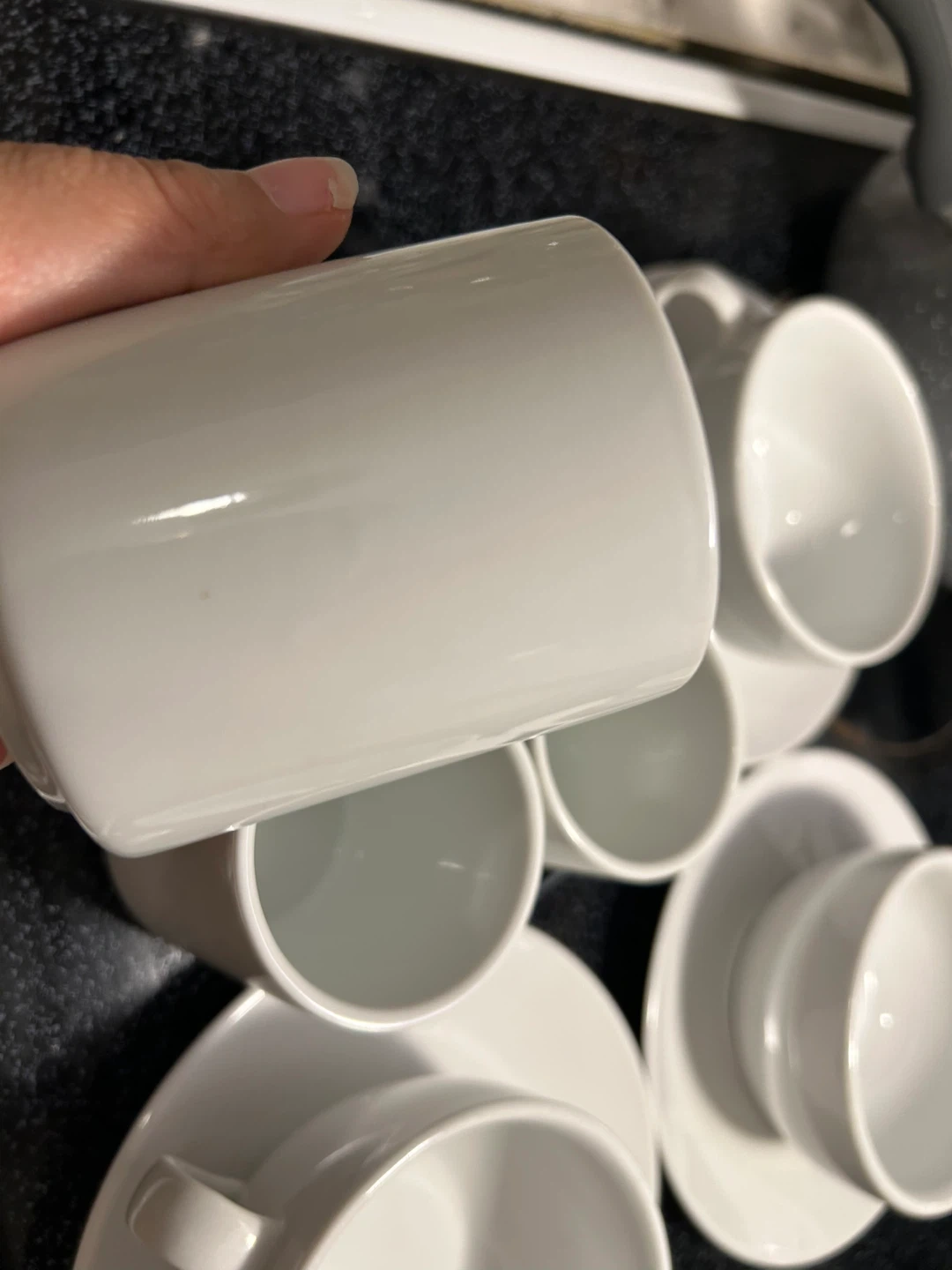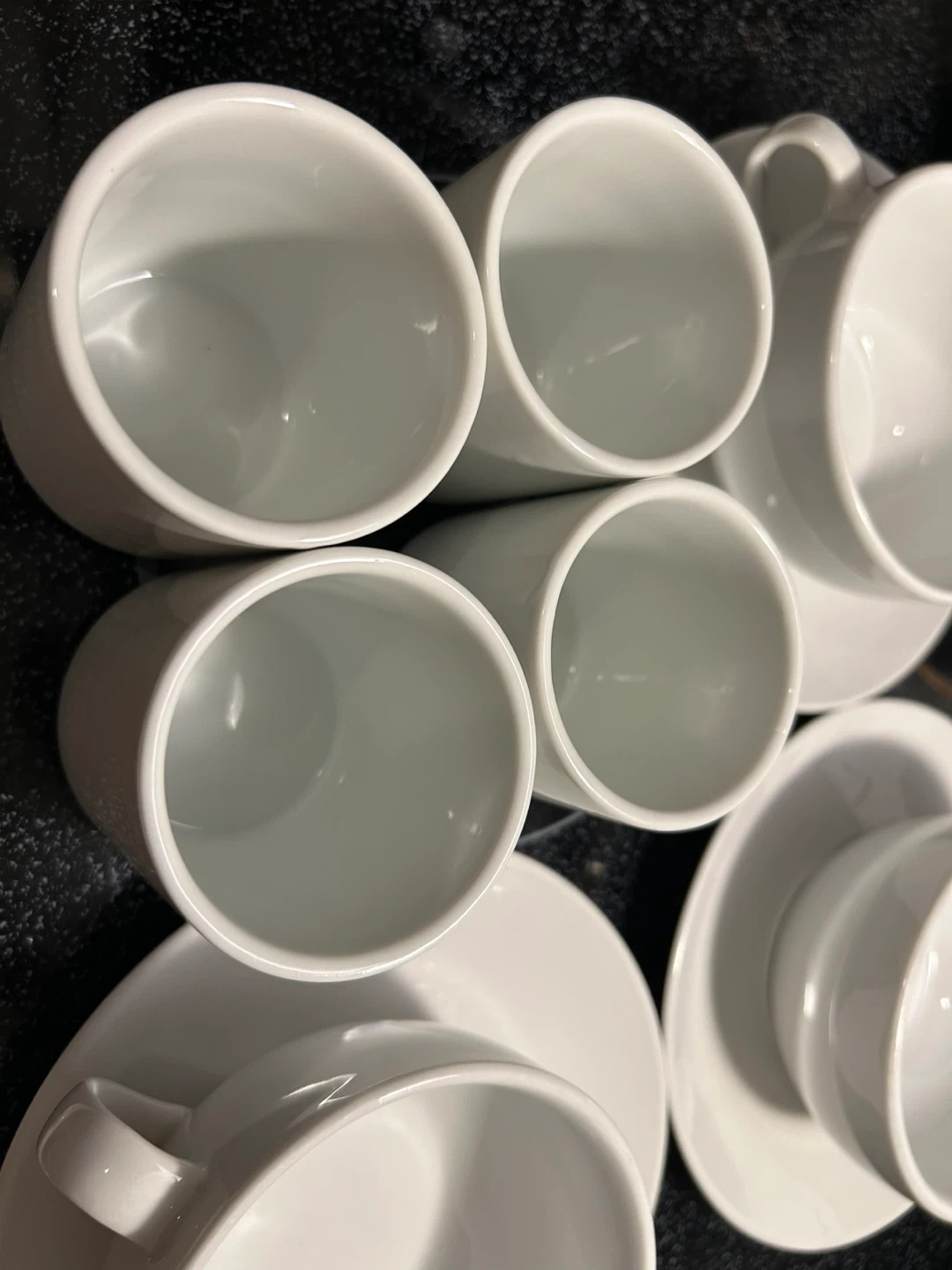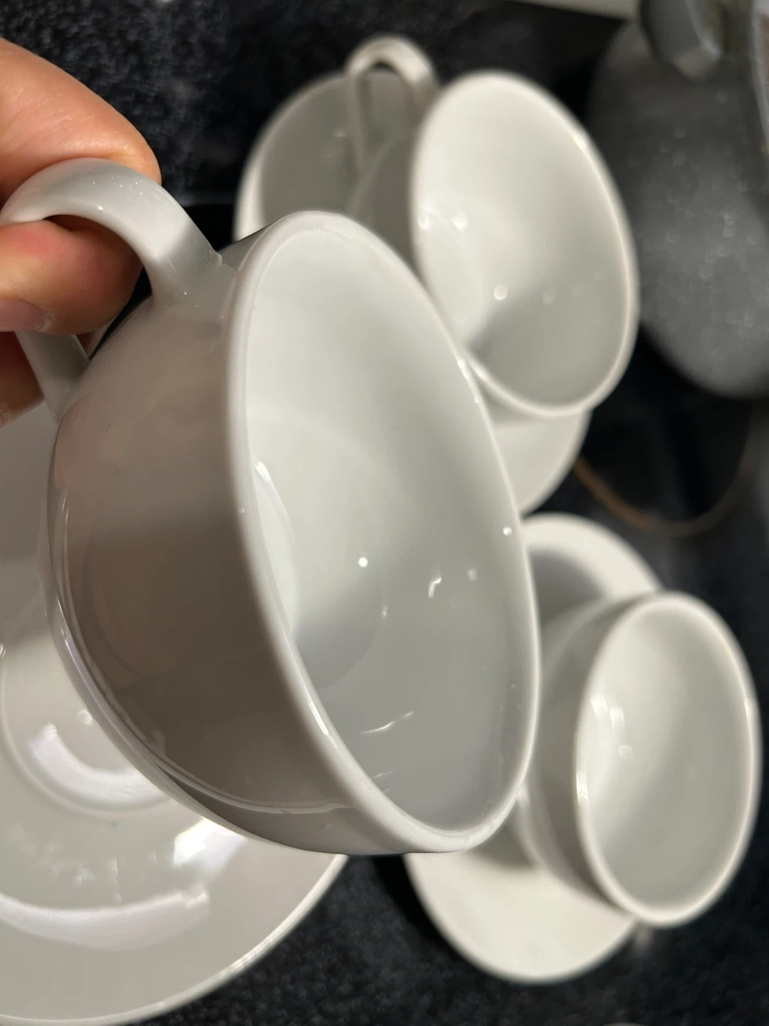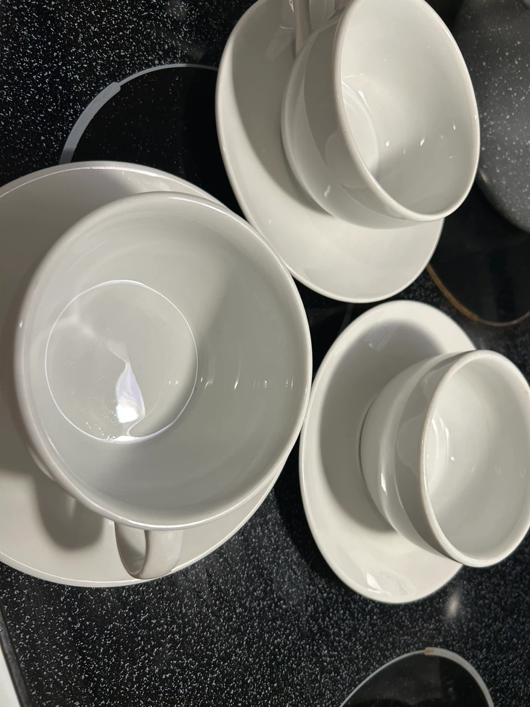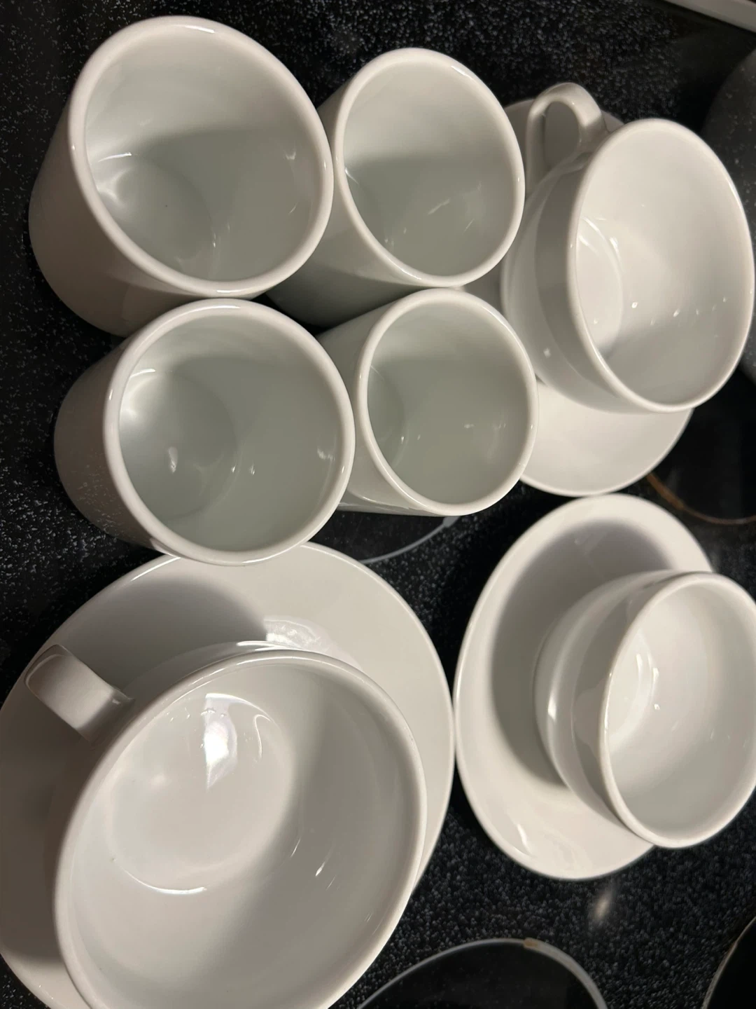 Selling a set of white cups plates snd soup bowls They are made with fine china and in great condition ready for a new home!