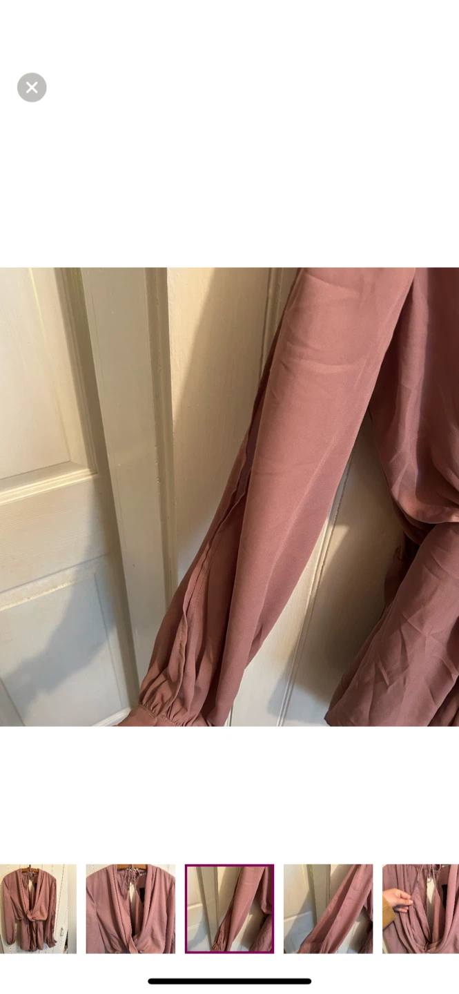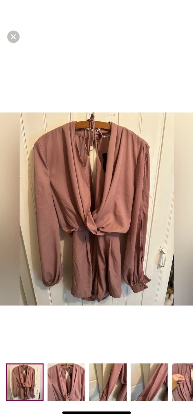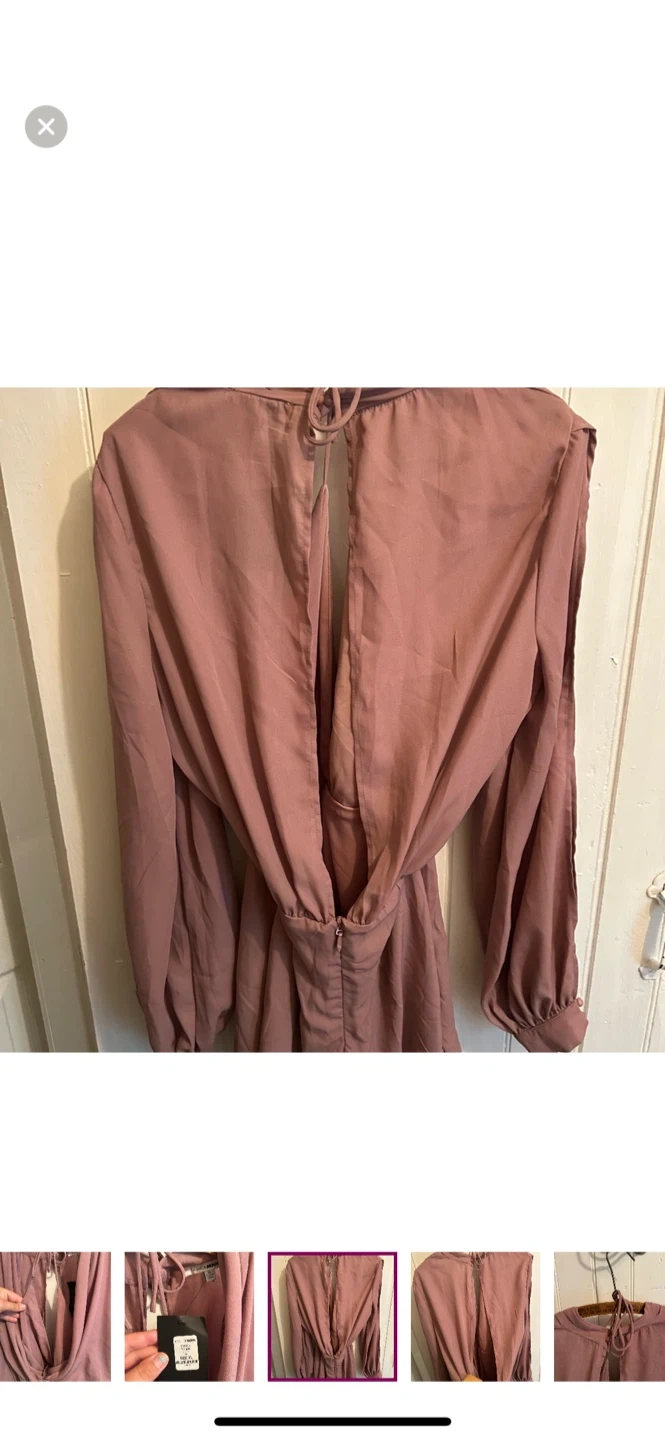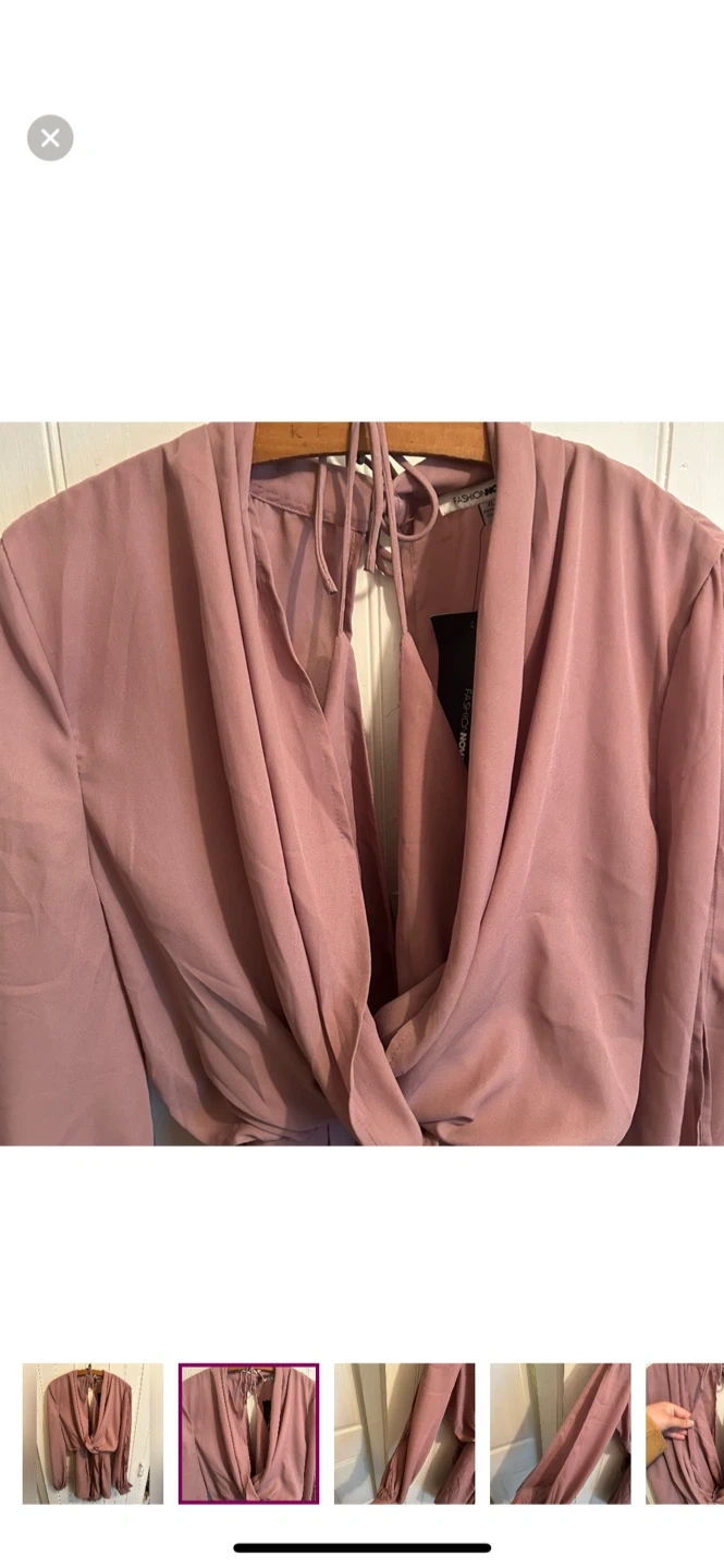 Fashion nova brand. Long sleeve shorts romper. Cuffed with slit from shoulder to cuff. Under slip with halter tie. Semi sheer wrap style vneck top with open back. Purple in colour. Size xl. Brand new condition