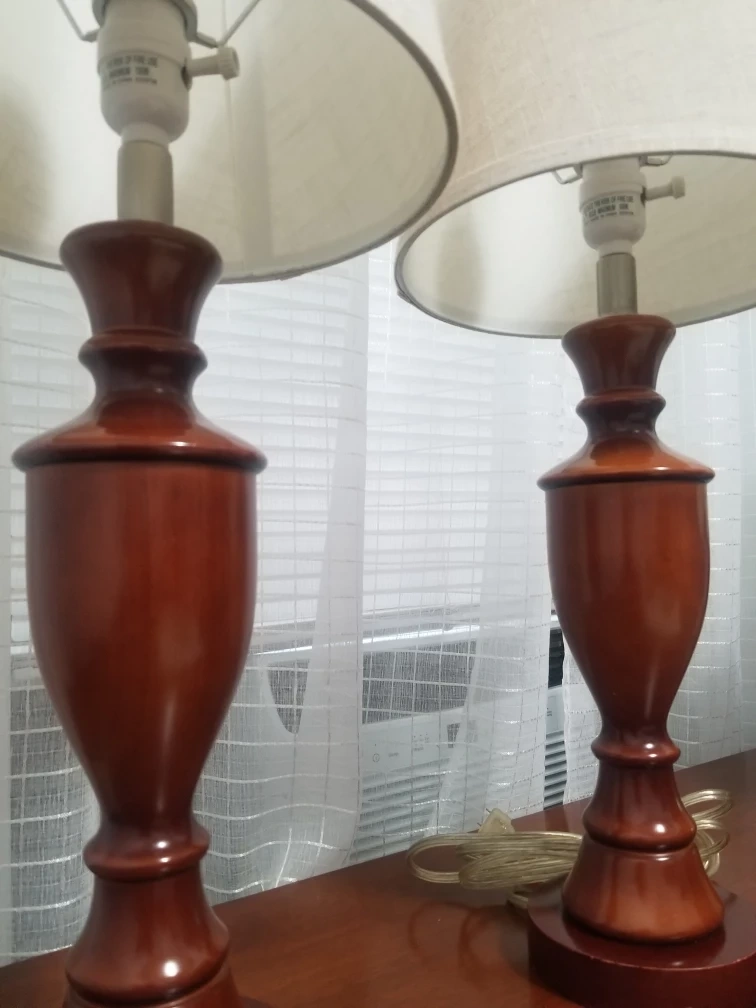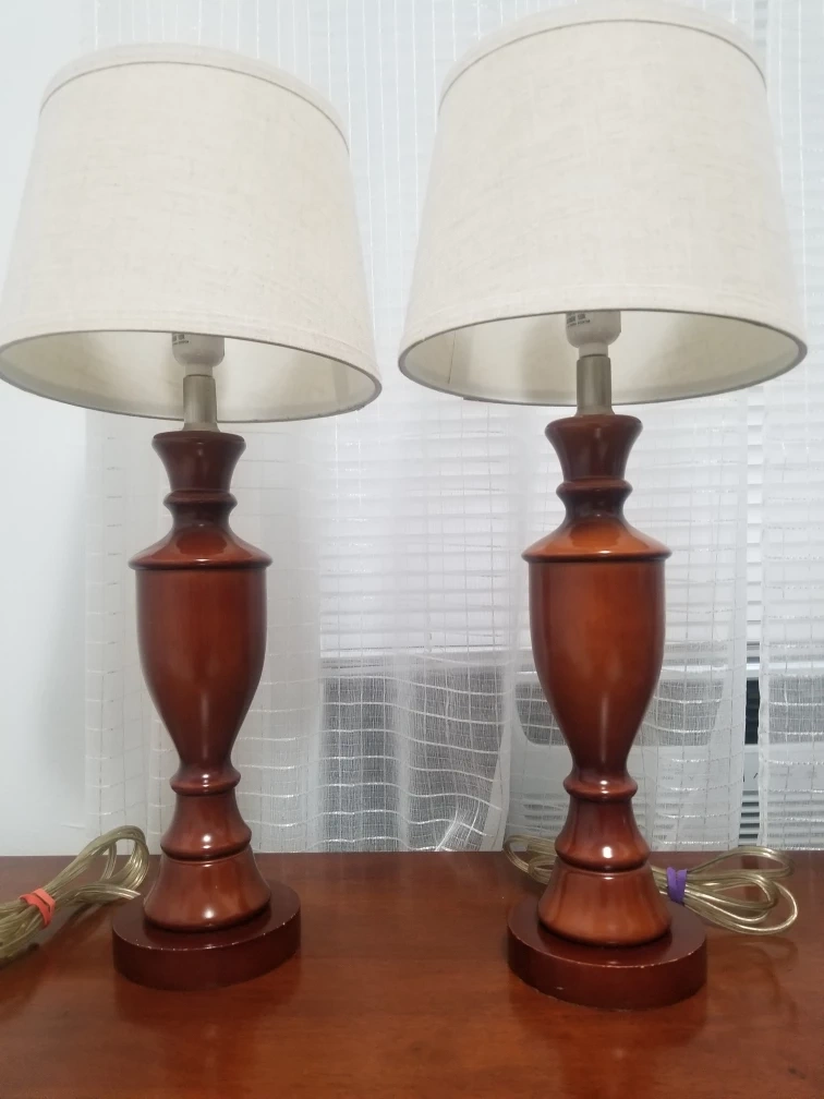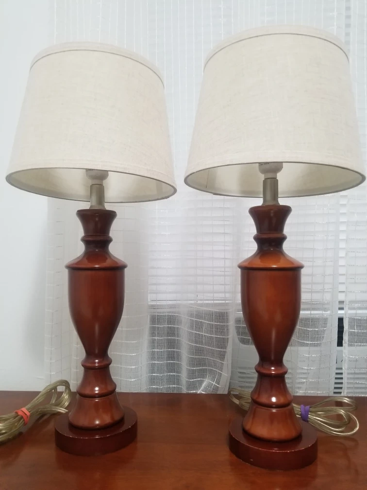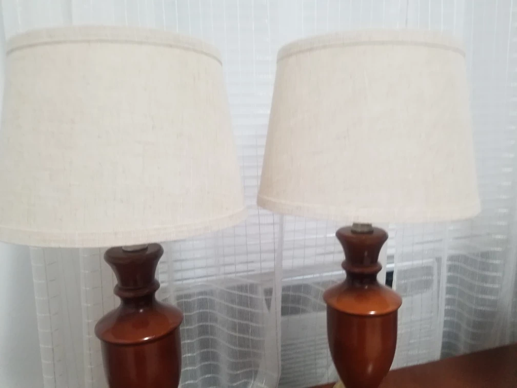Selling a pair of wooden table lamps. They have a classic design with a wood finish and off-white shades. These lamps would be a great addition to any room!