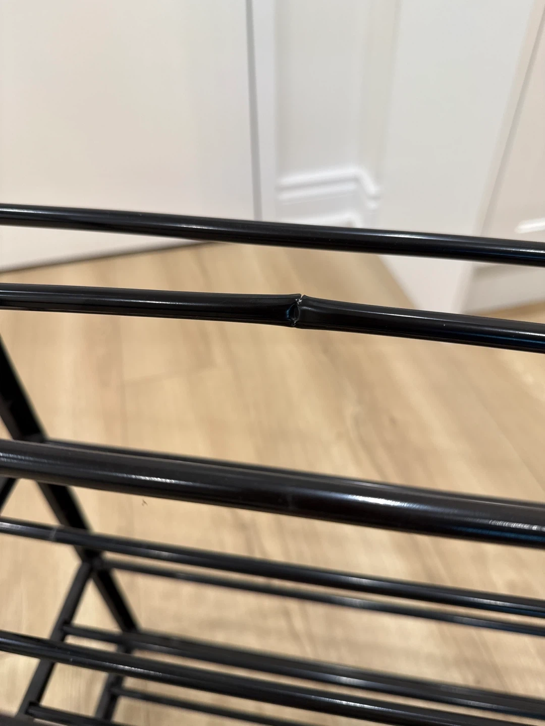 Selling a black metal shoe rack with four tiers. It's perfect for keeping your entryway or closet organized. There's a small dent on one of the bars, as shown in the picture, but it's still sturdy and functional!