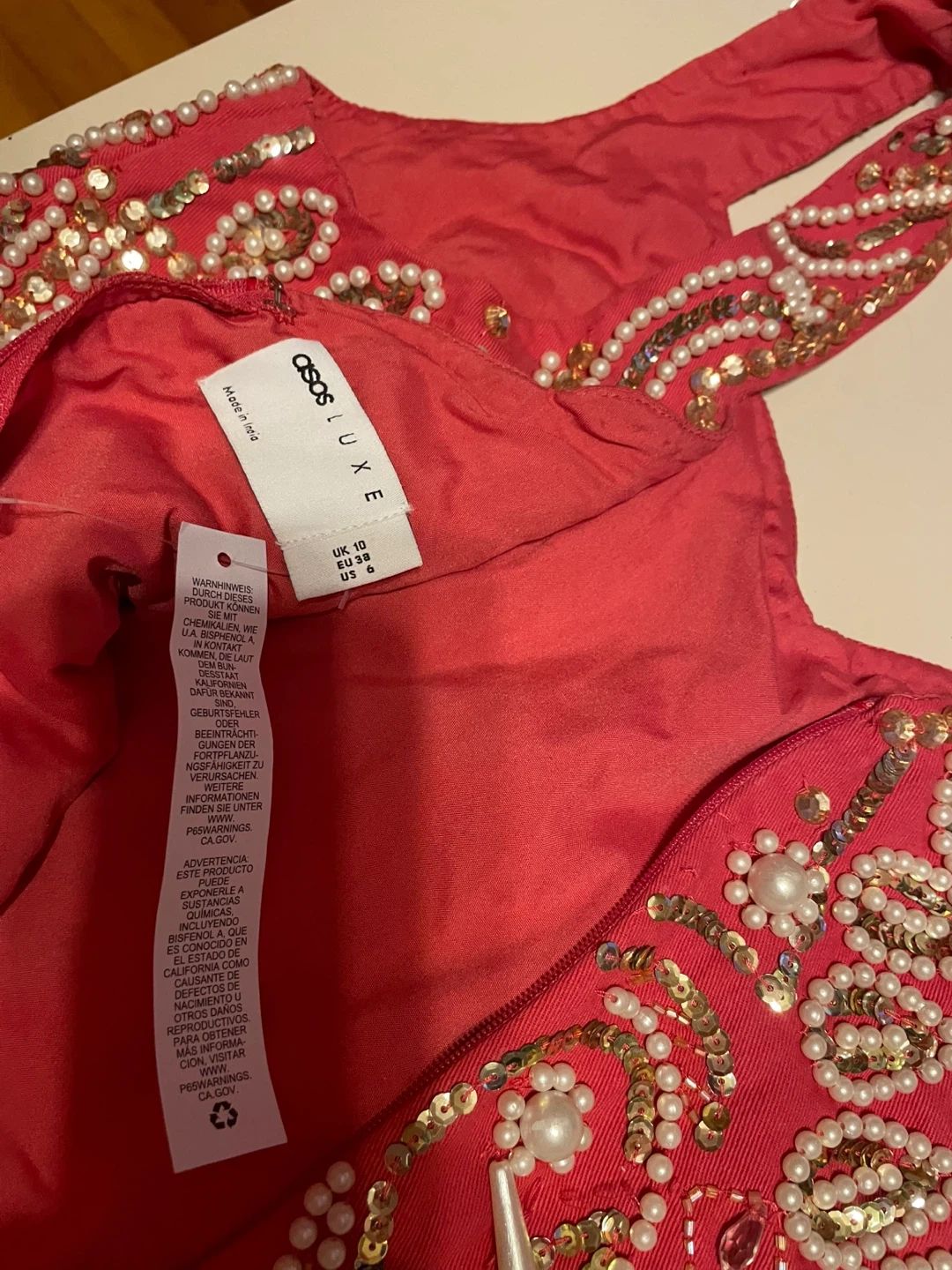 Selling a beautiful pink beaded dress from ASOS Luxe! It's a size US 6. The dress is adorned with intricate beadwork and would be perfect for a special occasion