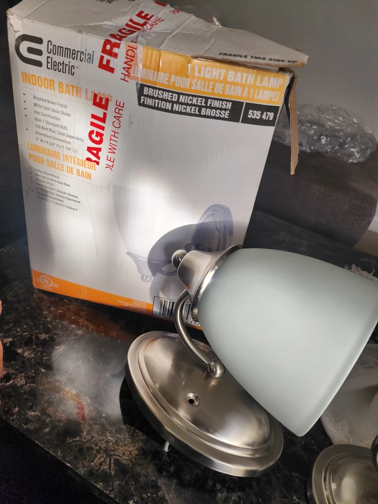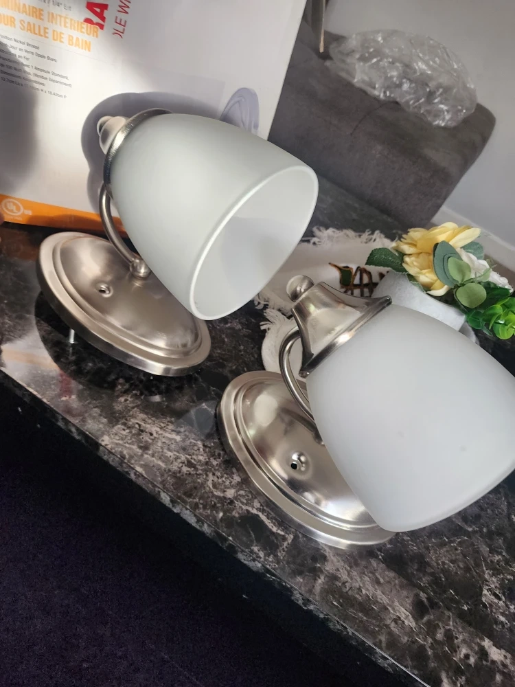 Selling a set of Commercial Electric indoor bath lights in brushed nickel finish with white opal glass shades. They require one standard bulb, max 100 watts. The dimensions are 5-9/16" W x 6-3/4" D x 7-1/4" H. Box included!