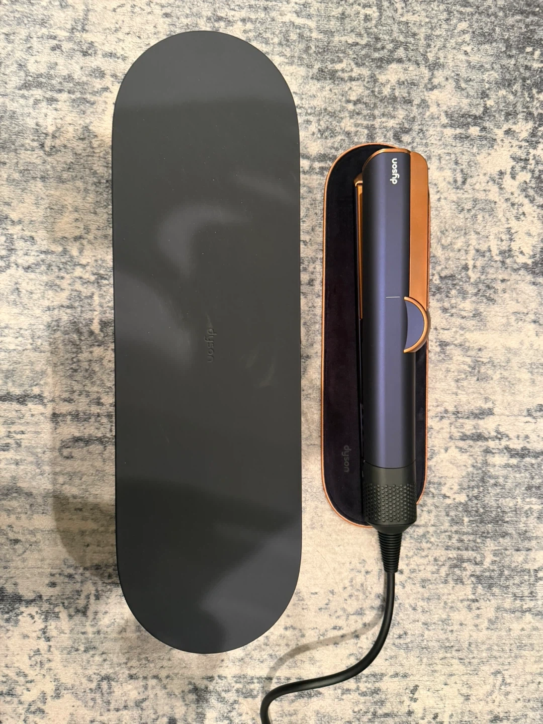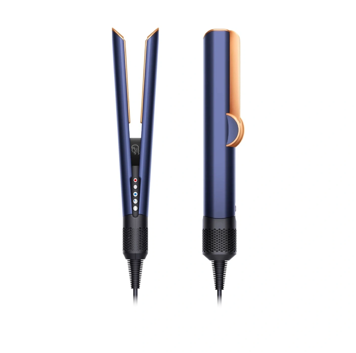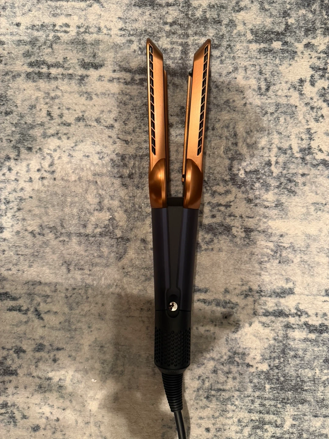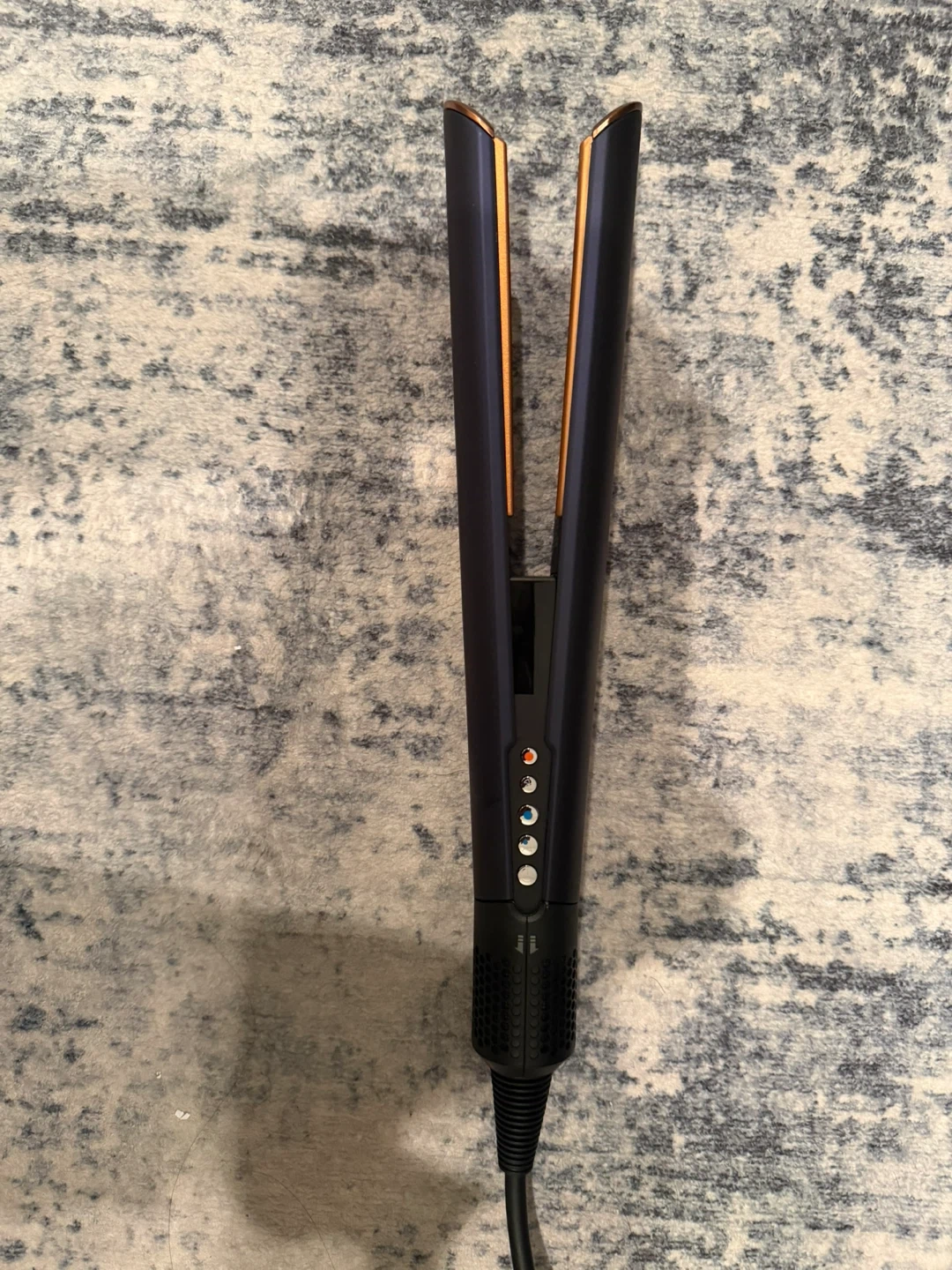 Selling a Dyson AirStrait hair straightener in blue and copper. It comes with its original stand and heat-resistant pad.