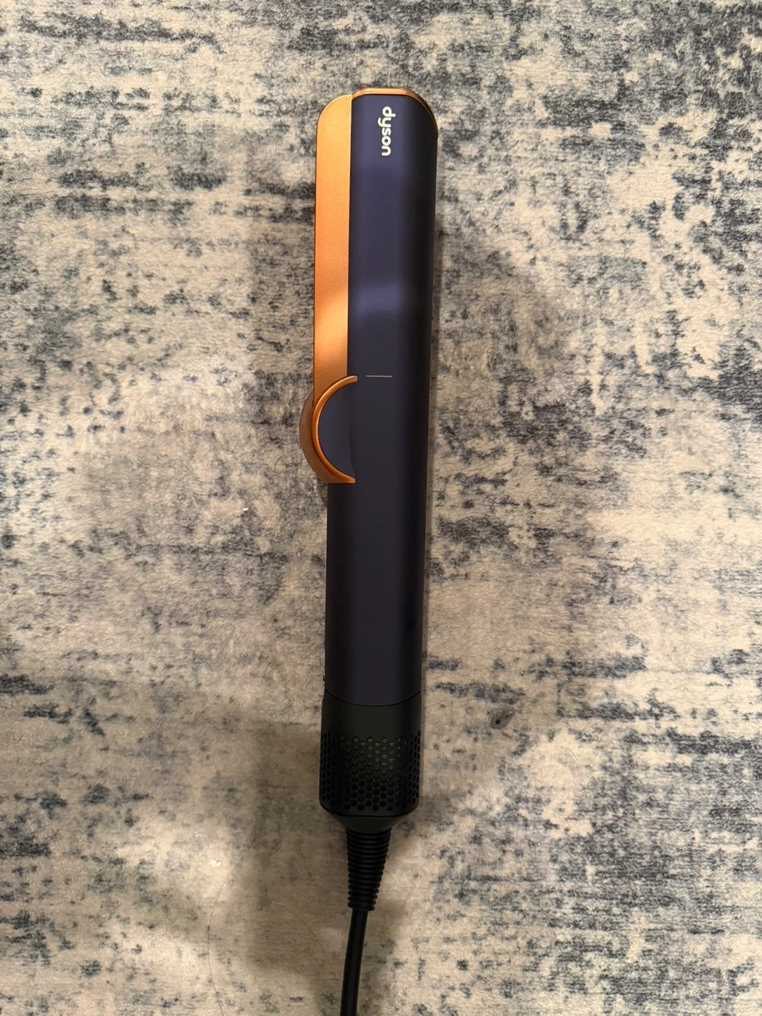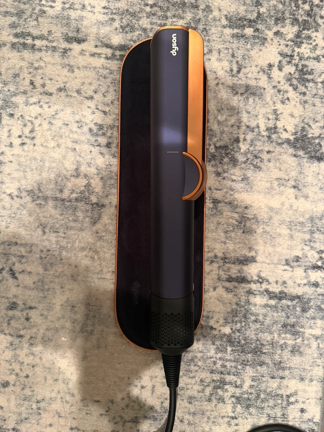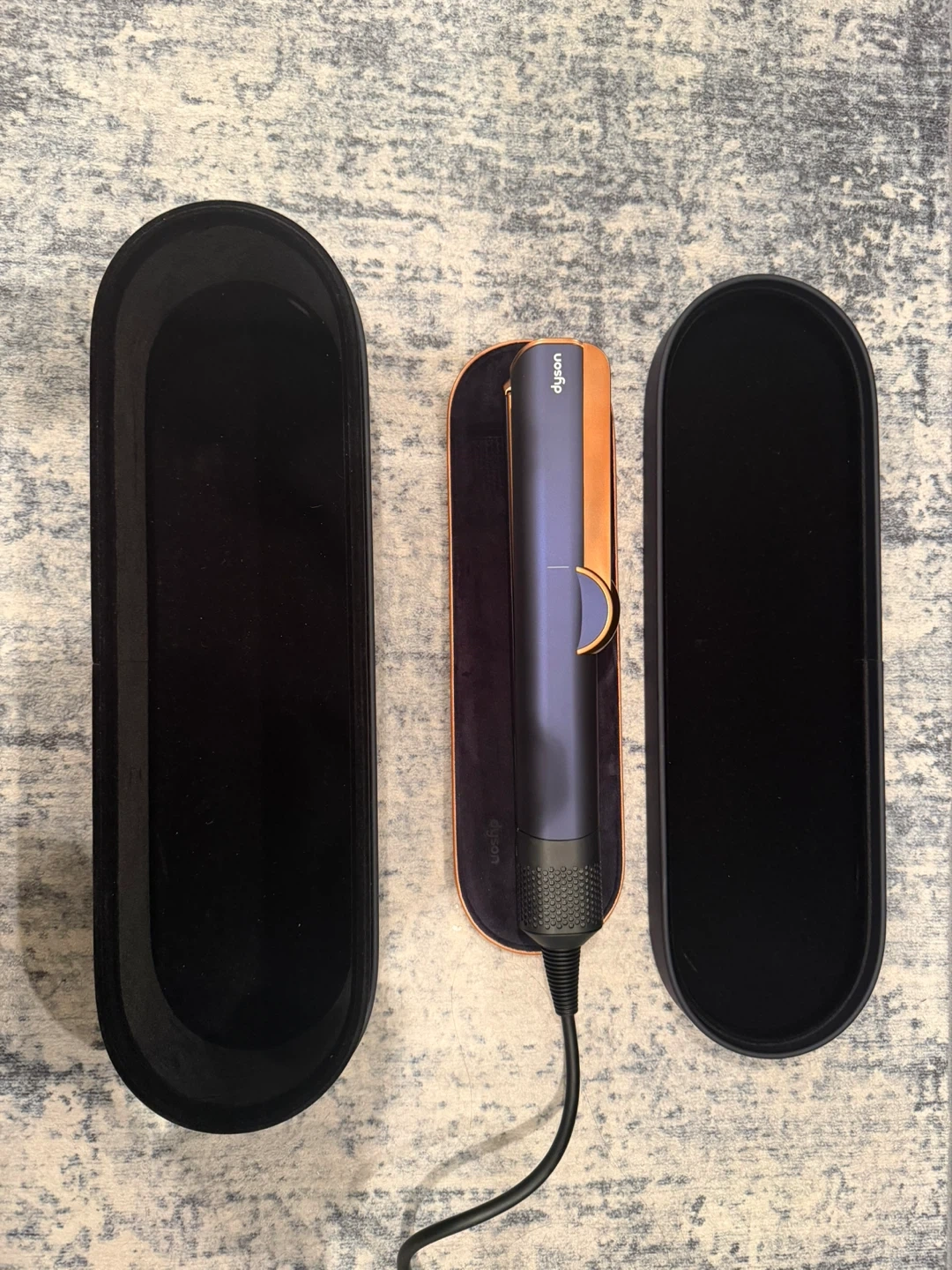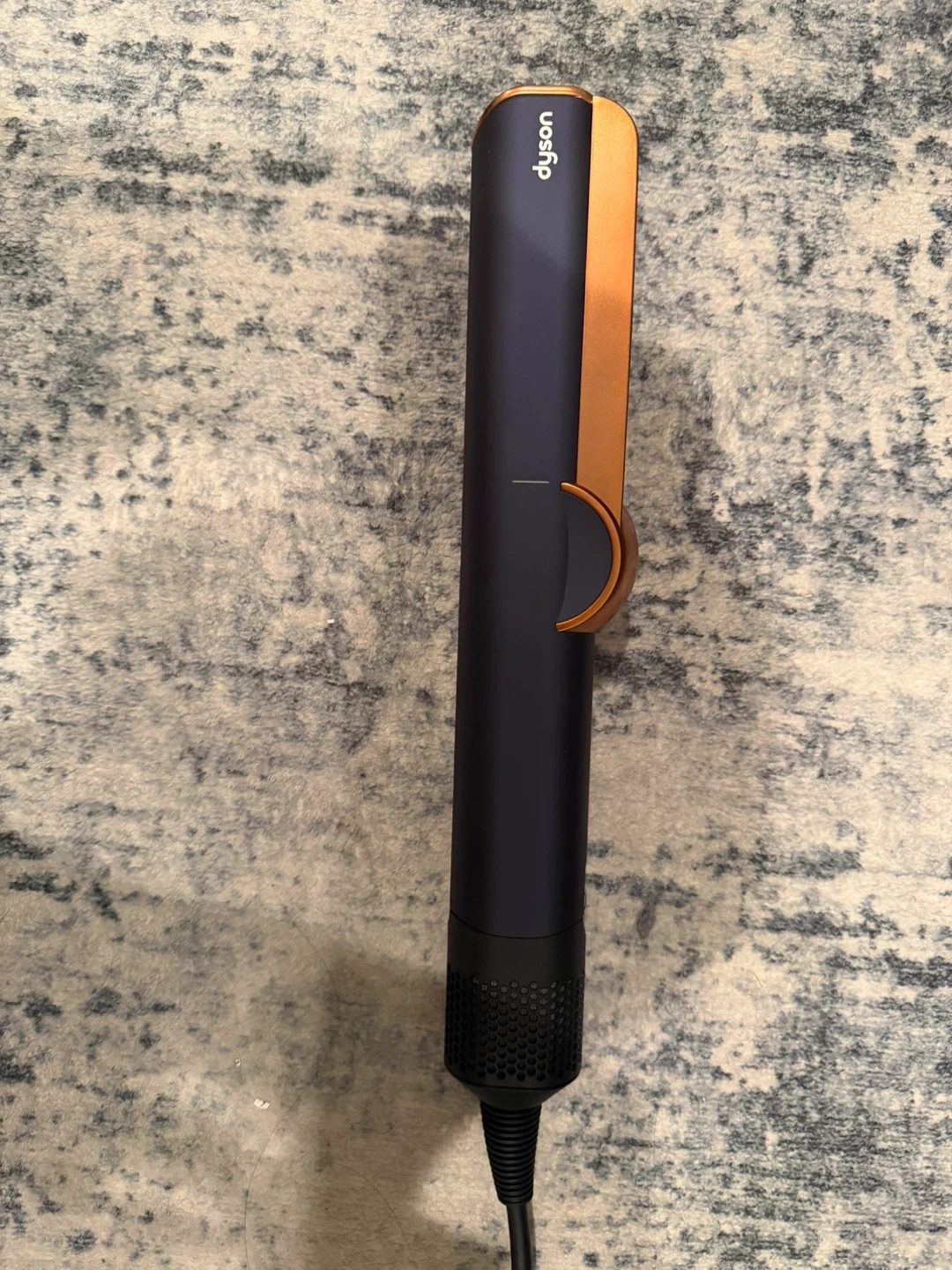 Selling a Dyson AirStrait hair straightener in blue and copper. It comes with its original stand and heat-resistant pad.