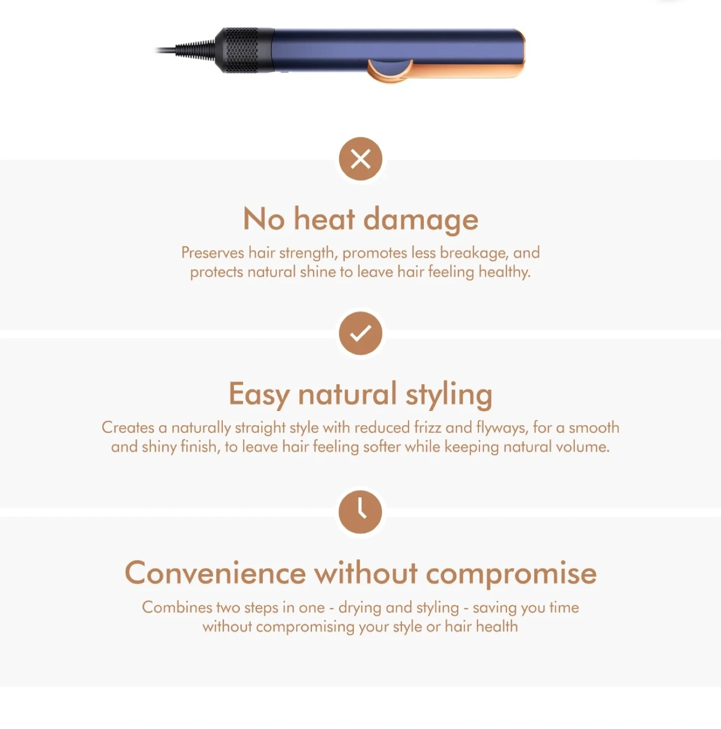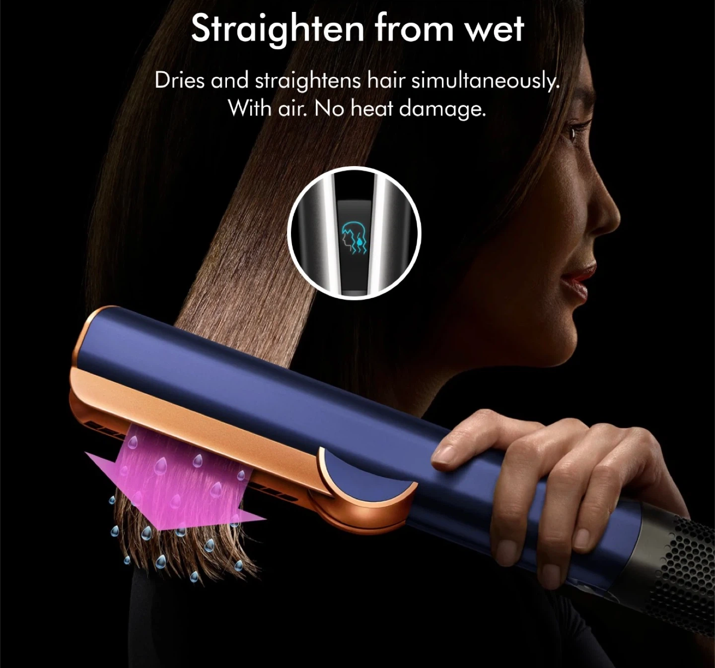 Engineered to maintain hair strength and protect shine.³ Our latest hair care innovation combines our expertise in airflow with everything we've learned about hair styling to pioneer a new way to straighten – with no heat damage.¹ CAVEAT 1: ¹When used in wet to dry mode. CAVEAT 3: ³When used in wet to dry mode vs. unstyled, untreated hair.