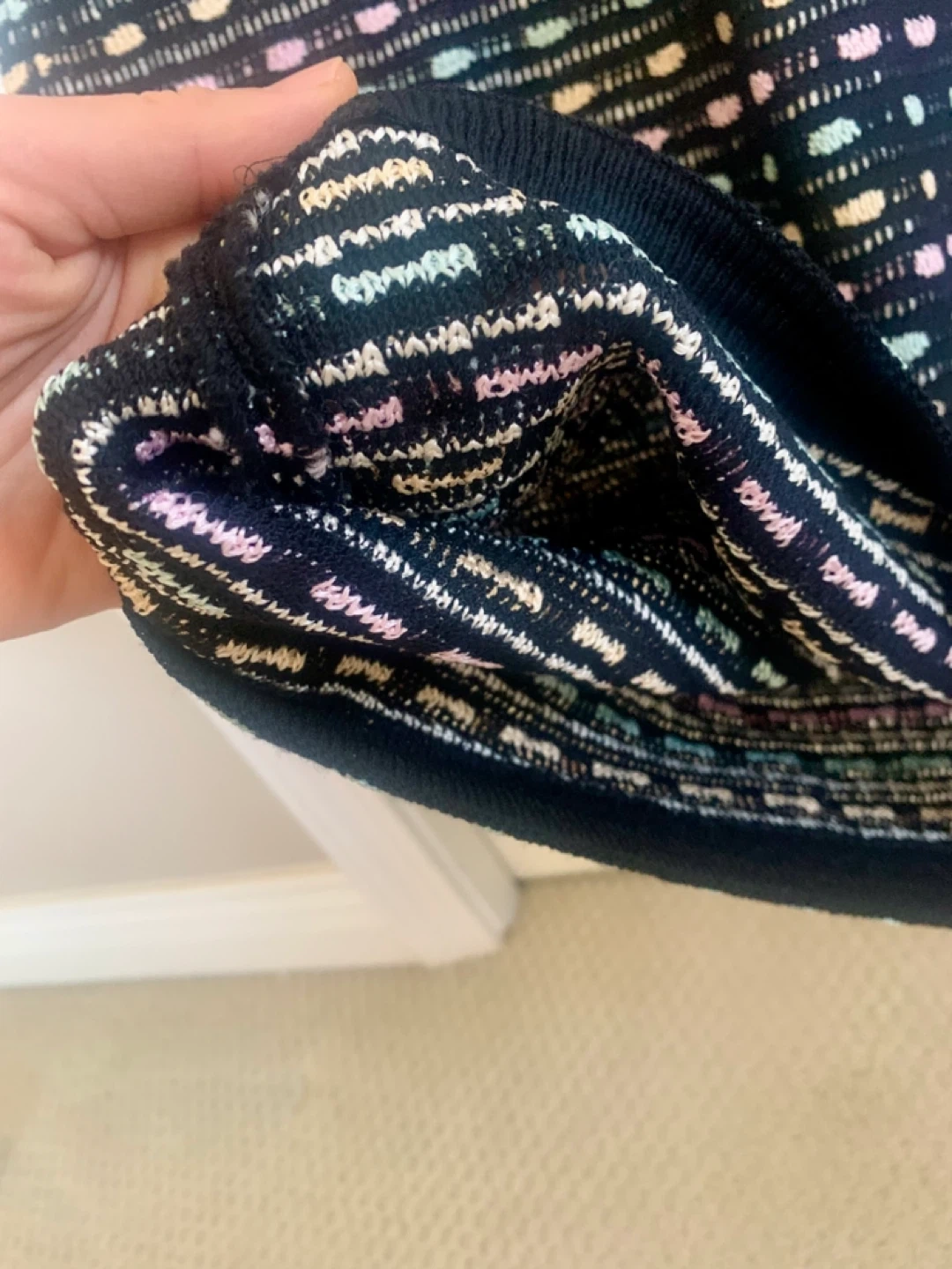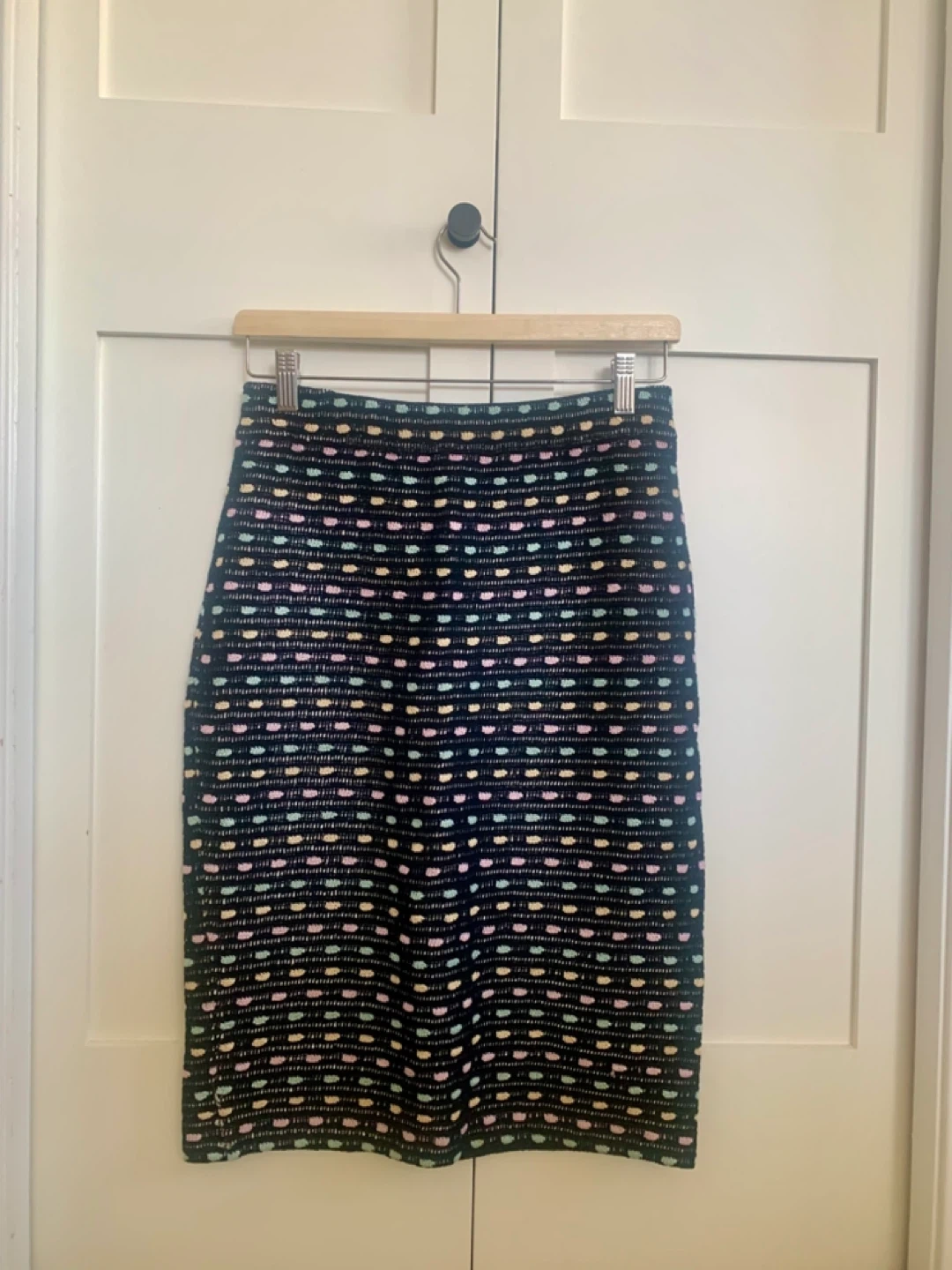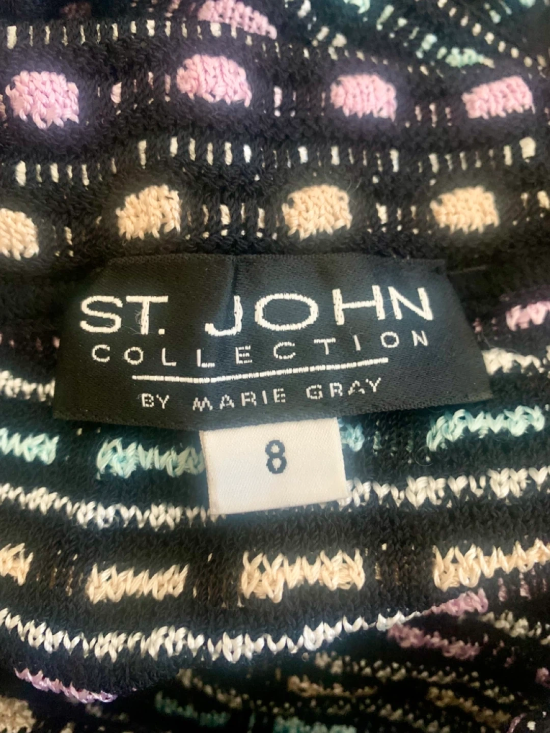 This is a ST. JOHN COLLECTION skirt by Marie Gray in size 8. It features a unique pattern with pastel colours on a black base. It's in great condition and ready for a new home!