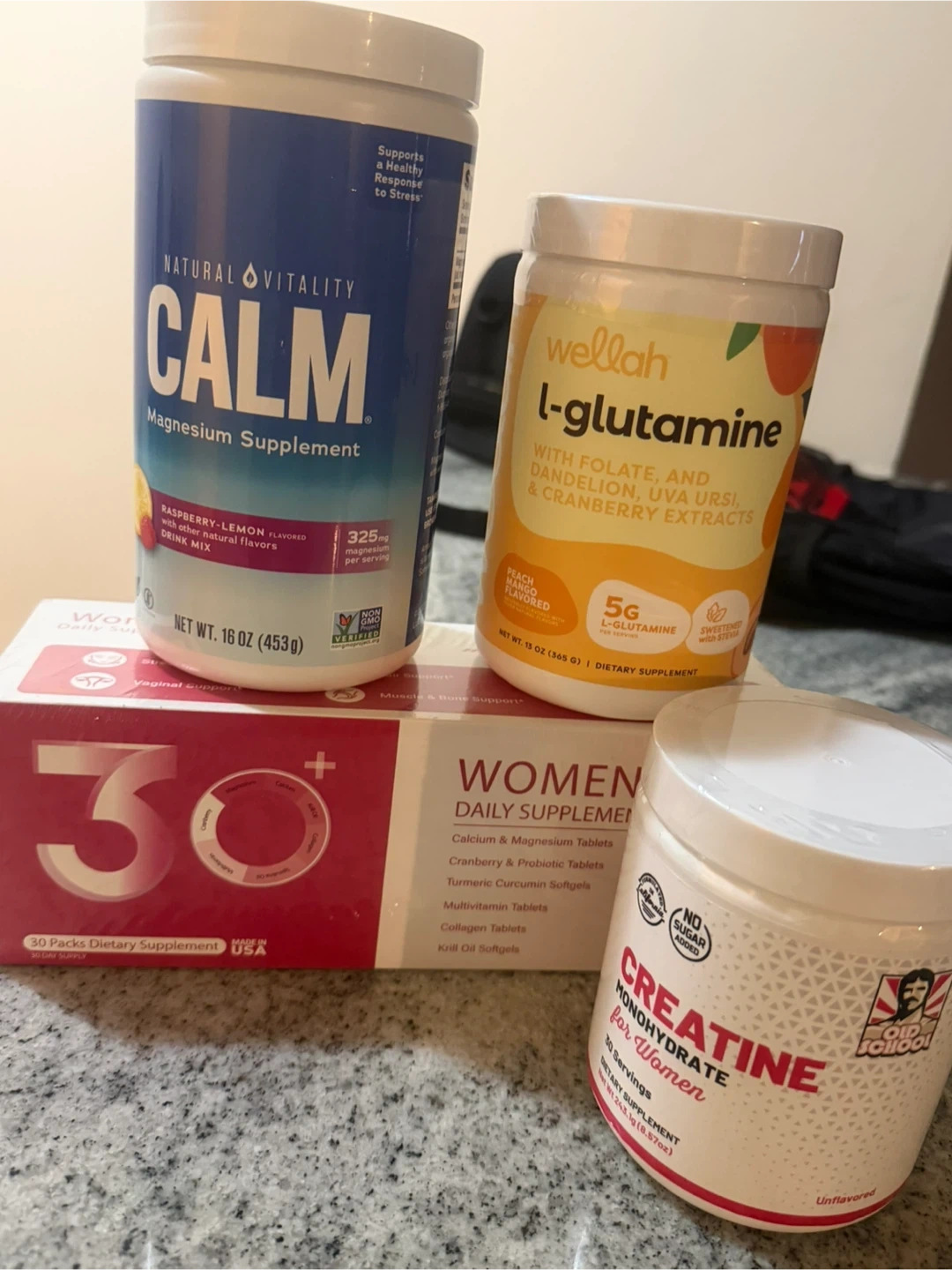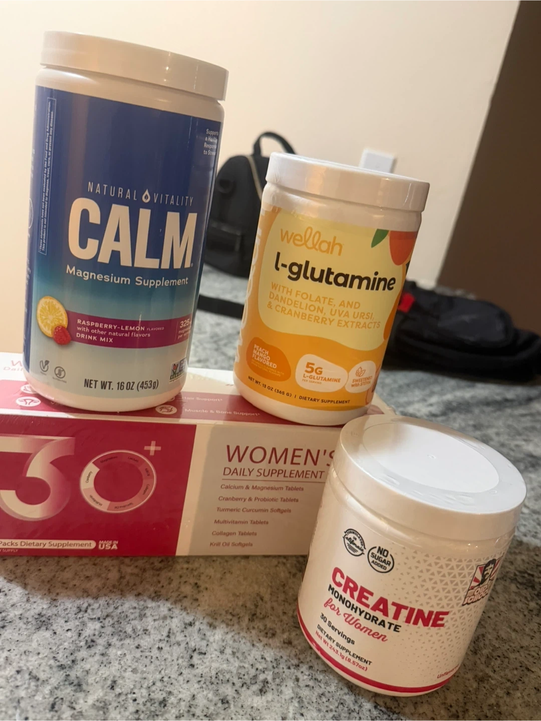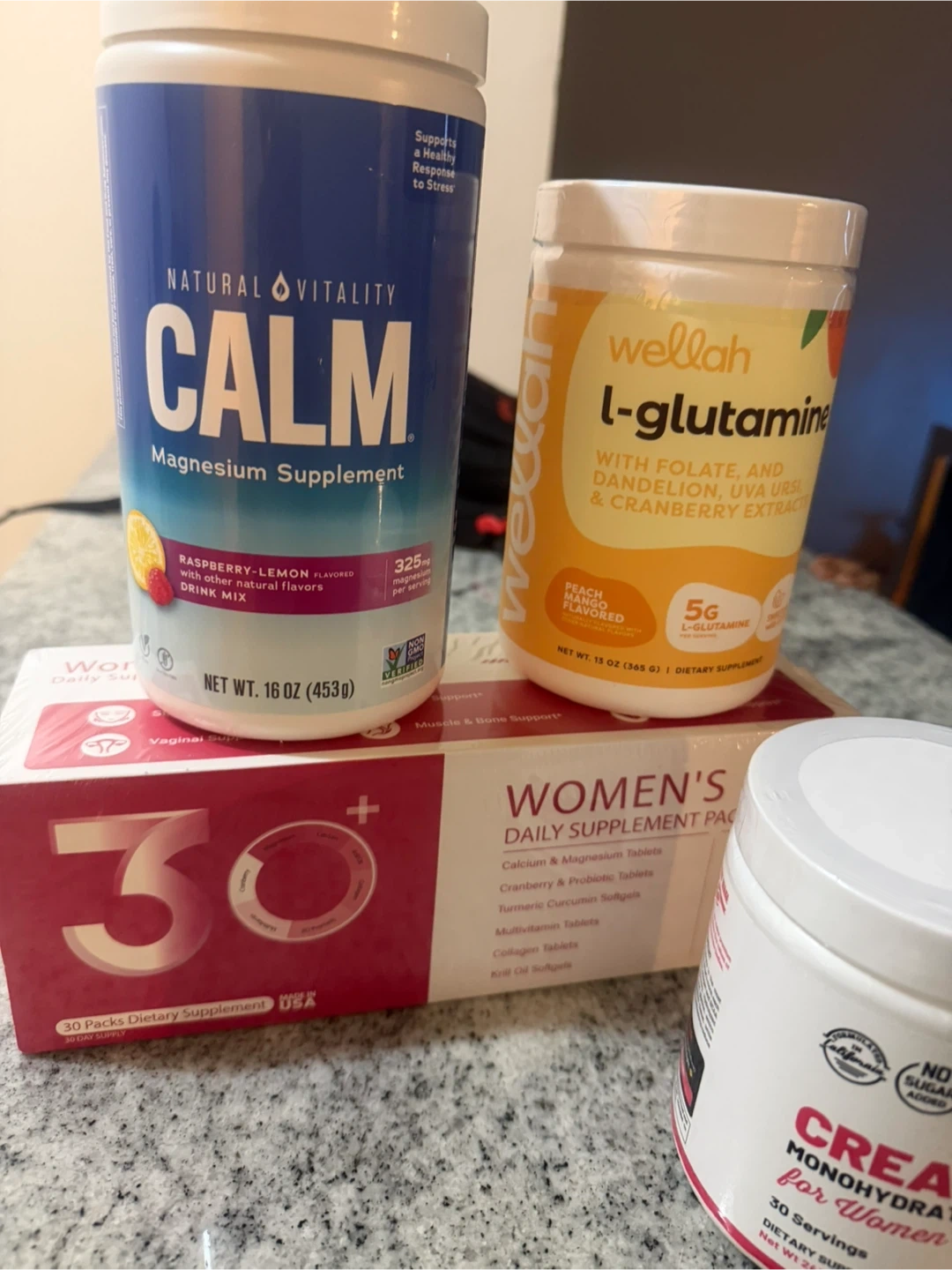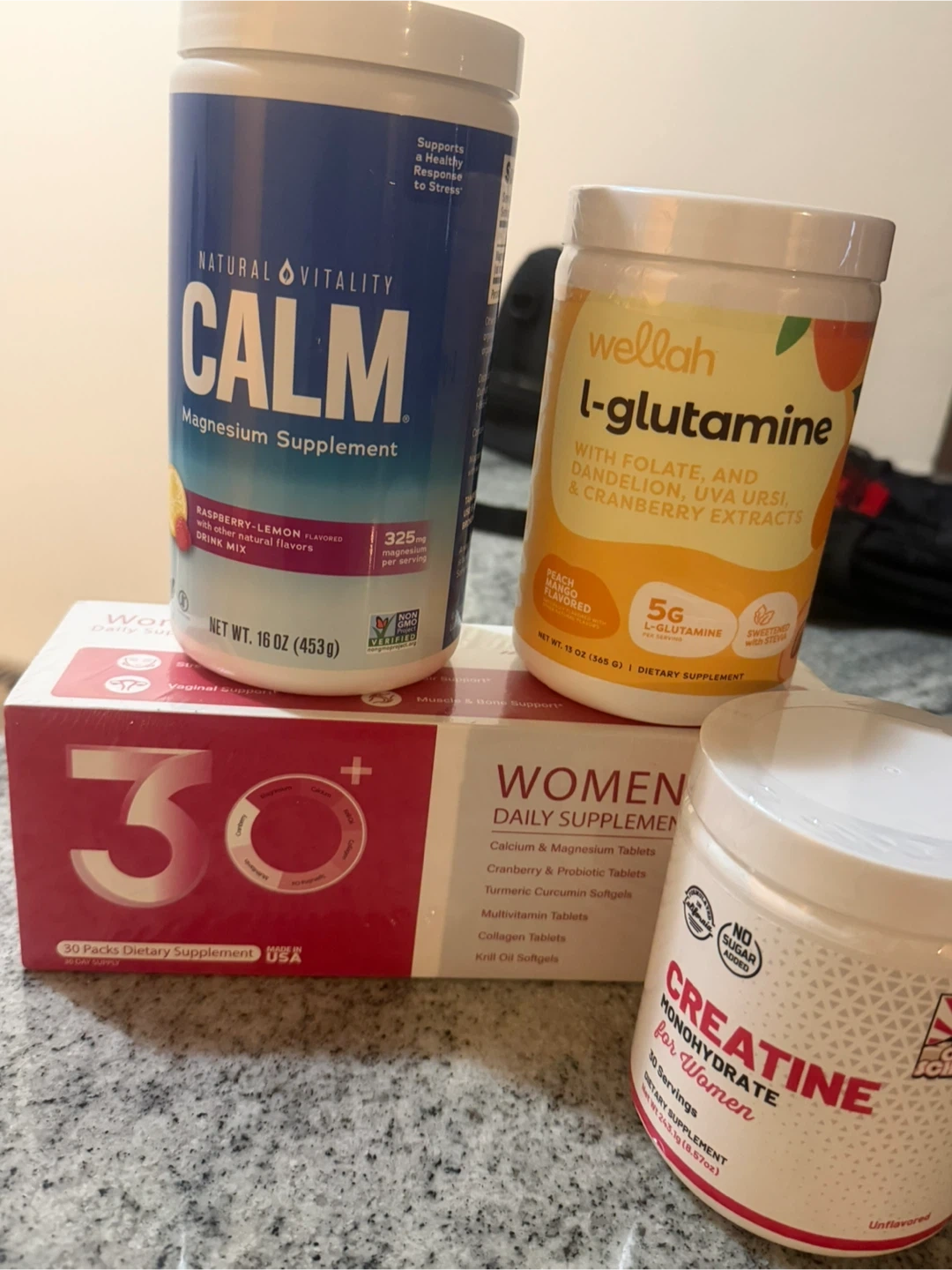 I'm selling a Natural Vitality Calm Magnesium Supplement, Raspberry-Lemon flavored drink mix! It supports a healthy response to stress and contains 325mg of magnesium per serving. Also included is Wellah L-Glutamine with folate, dandelion, UVA ursi, and cranberry extracts, peach mango flavored with 5g L-Glutamine. Also included is Women's Daily Supplement with Calcium & Magnesium Tablets, Cranberry & Probiotics Tablets, Turmeric Curcumin Softgels, Multivitamin Tablets, Collagen Tablets, and Krill Oil Softgels.