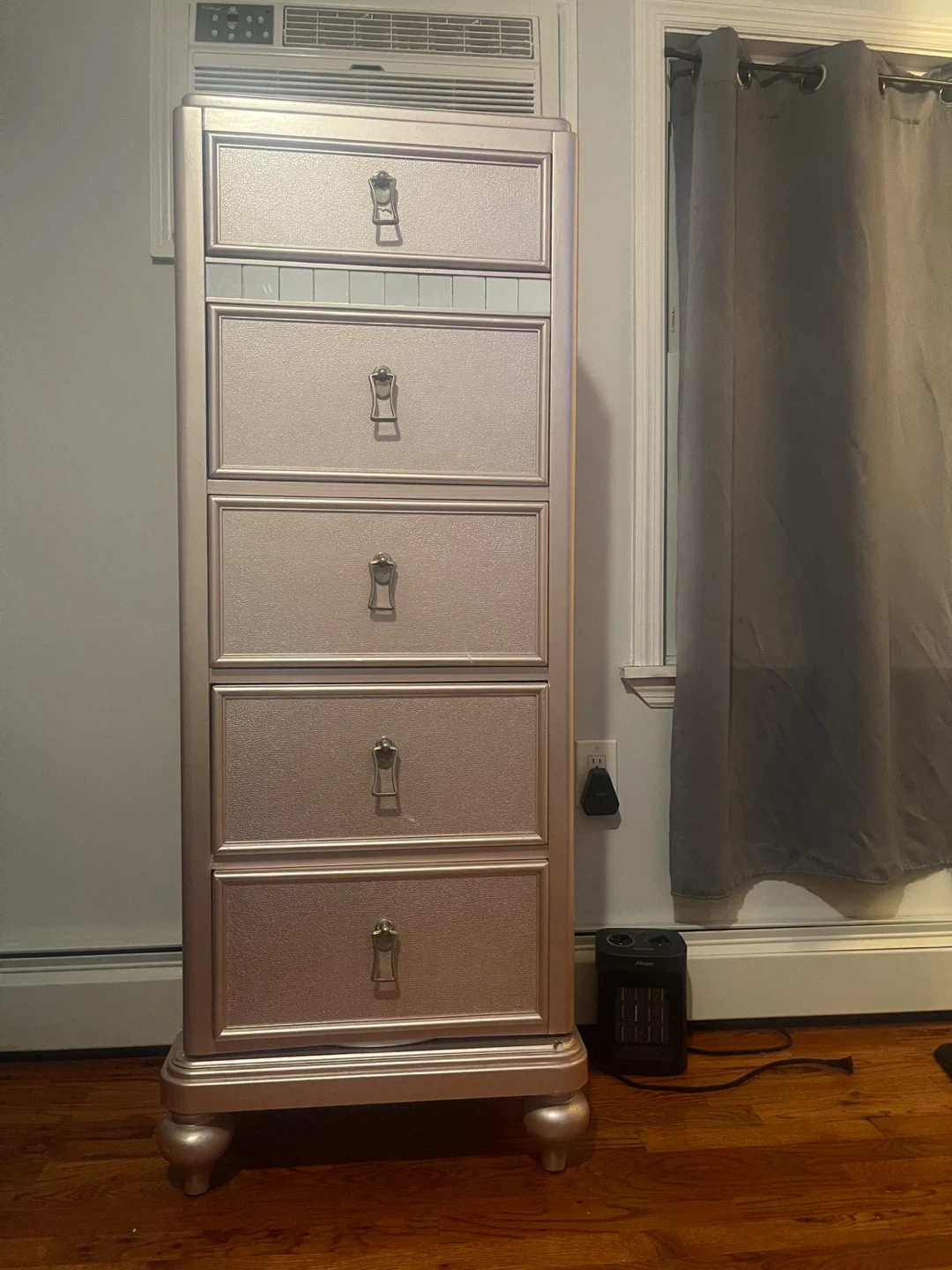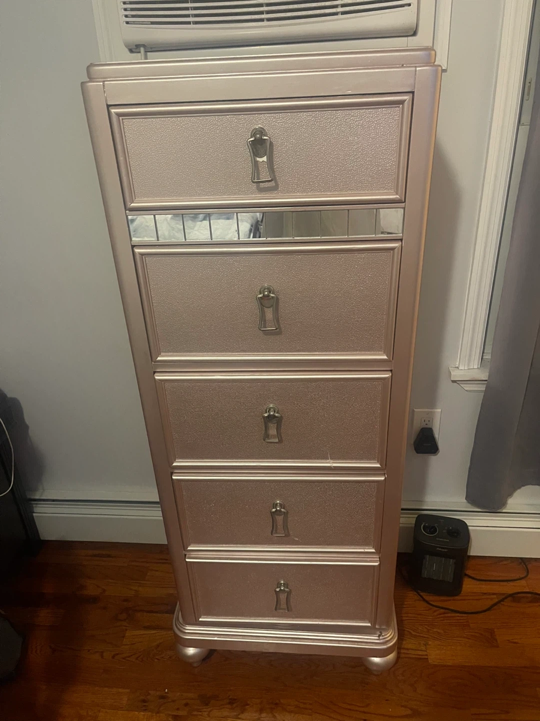 Selling two cute pink chest of drawers with mirrored accents! These are great pieces to add some sparkle to your room. The chests have multiple drawers for storage, perfect for organizing your space. They swivel to revealed body length mirrors in the back.
