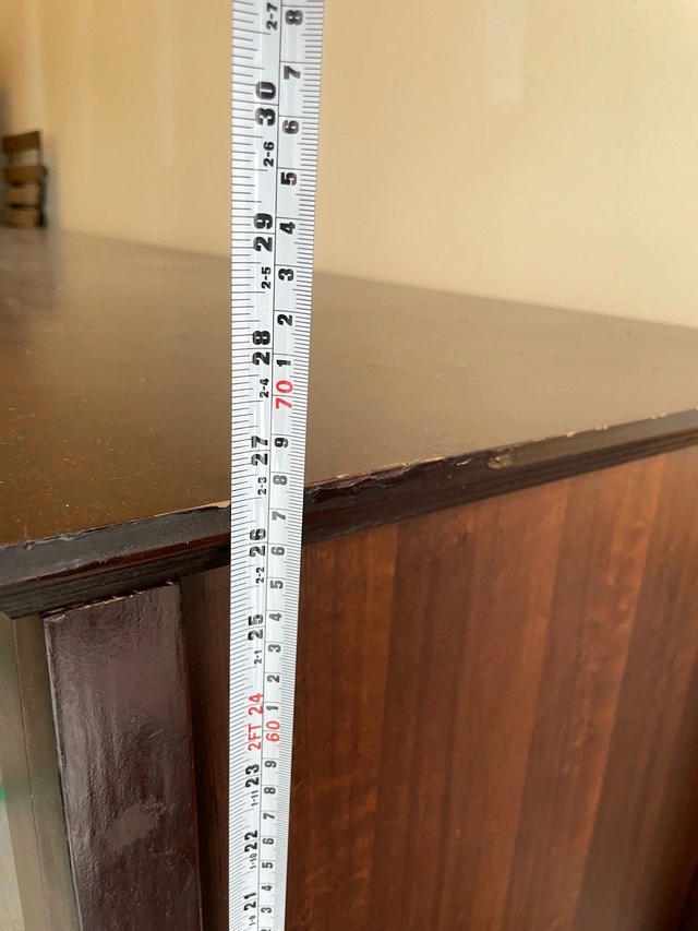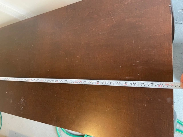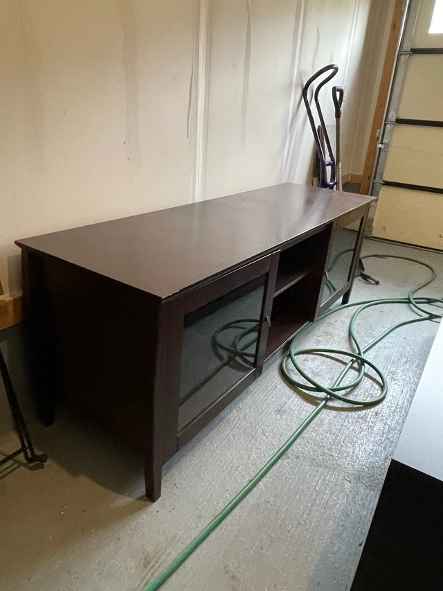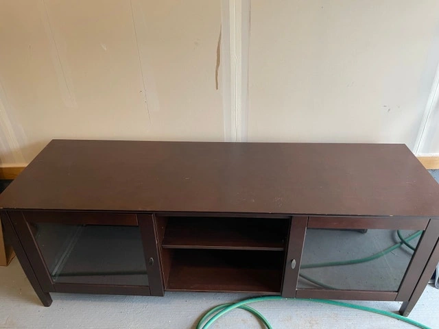 This is a used TV stand in good condition, perfect for any living room setup. It measures approximately 72 inches in length, 22 inches in width, and 30 inches in height, offering ample space for your television and media devices. The stand features glass doors on either side with shelves in the middle. It has some minor signs of wear. Needs two ppl to lift and carry. Make sure it will fit in your truck.