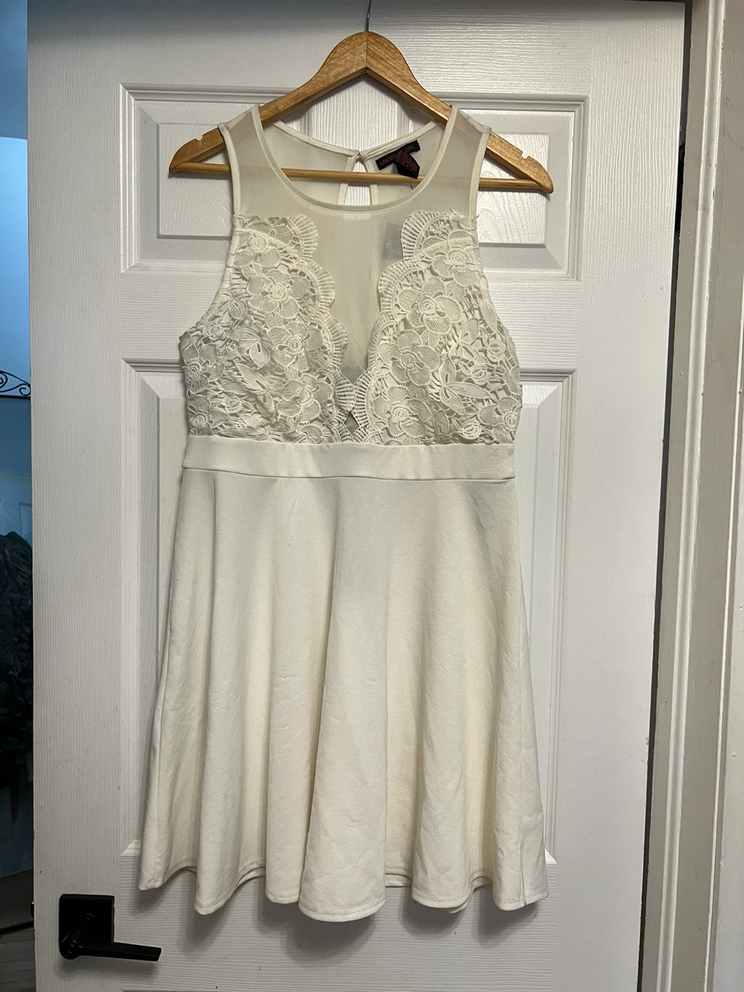 Selling a Material Girl new white dress in size XL. It's a beautiful dress with lace detailing on the top and a flattering fit. The material is a blend of polyester, nylon, and spandex for a comfortable stretch. Perfect for a special occasion or a night out!