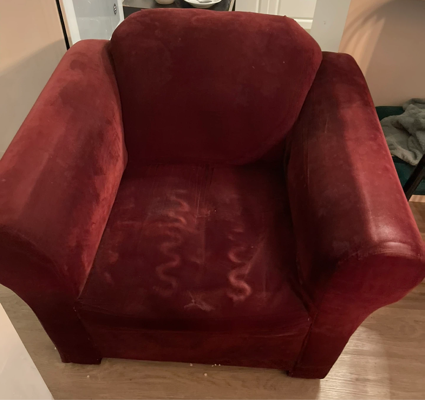 Selling a comfy armchair! It's a burgundy colour and would be perfect for a reading nook or living room. It has some signs of wear, as pictured.