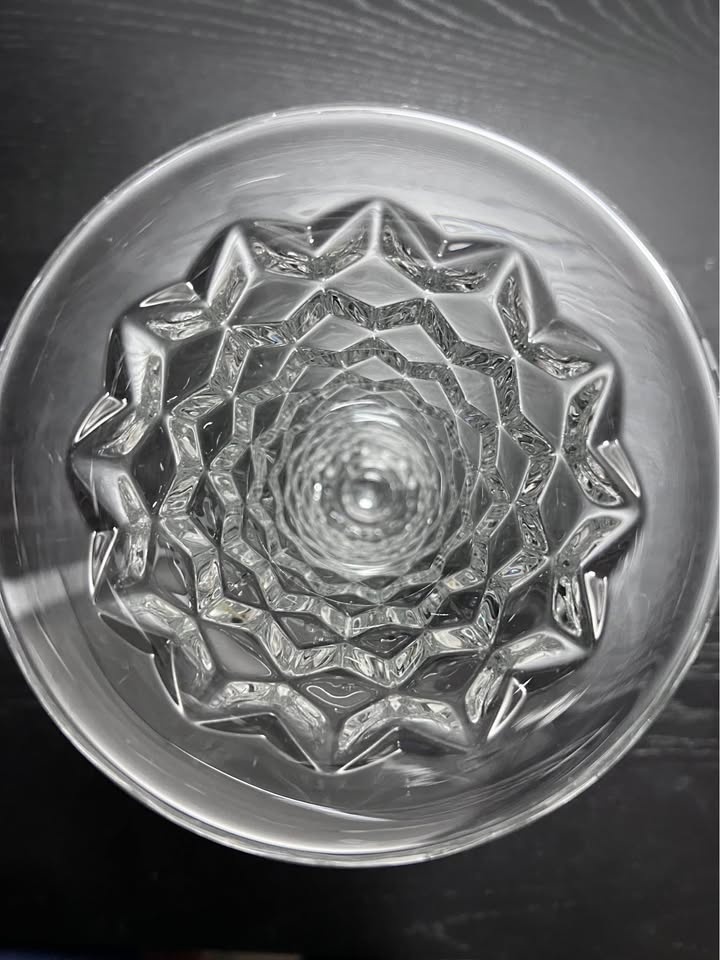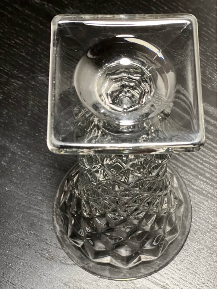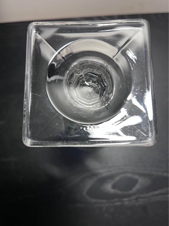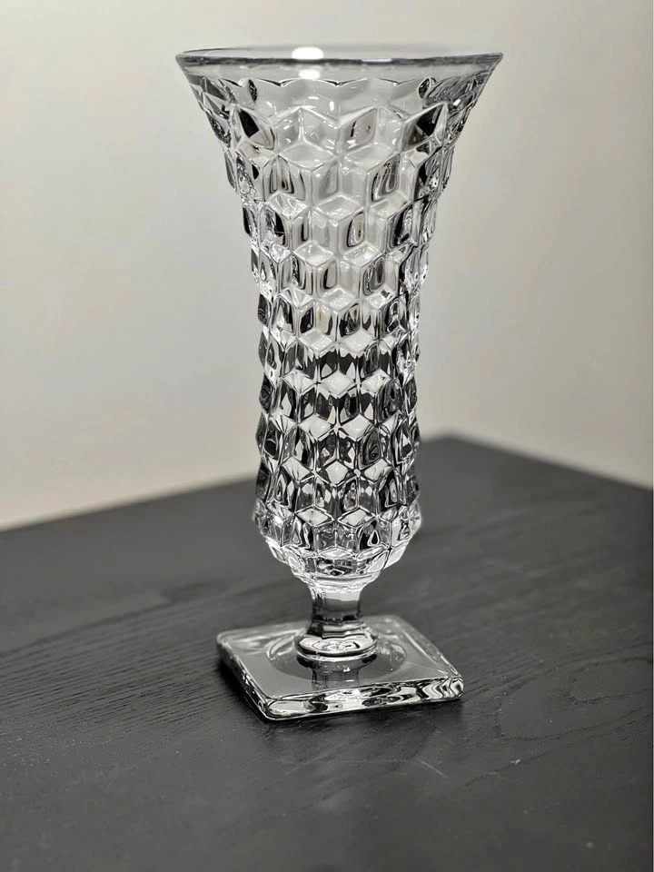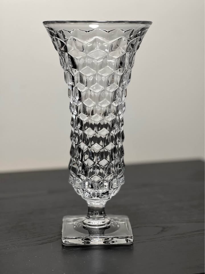 The MCM Fostoria AMERICAN 9-3/4" Square Footed Flared Rim Flower Vase is a vintage piece of pressed glass from the mid 20th century. This weighty, elegant vase features clear glass with a glossy finish and a square base. Made in the United States by Fostoria, this original vase is a perfect addition to any collection of decorative pottery and glassware. The Fostoria American cubic pattern and Mid-Century Modern style make this vase a unique and timeless piece for any home decor.