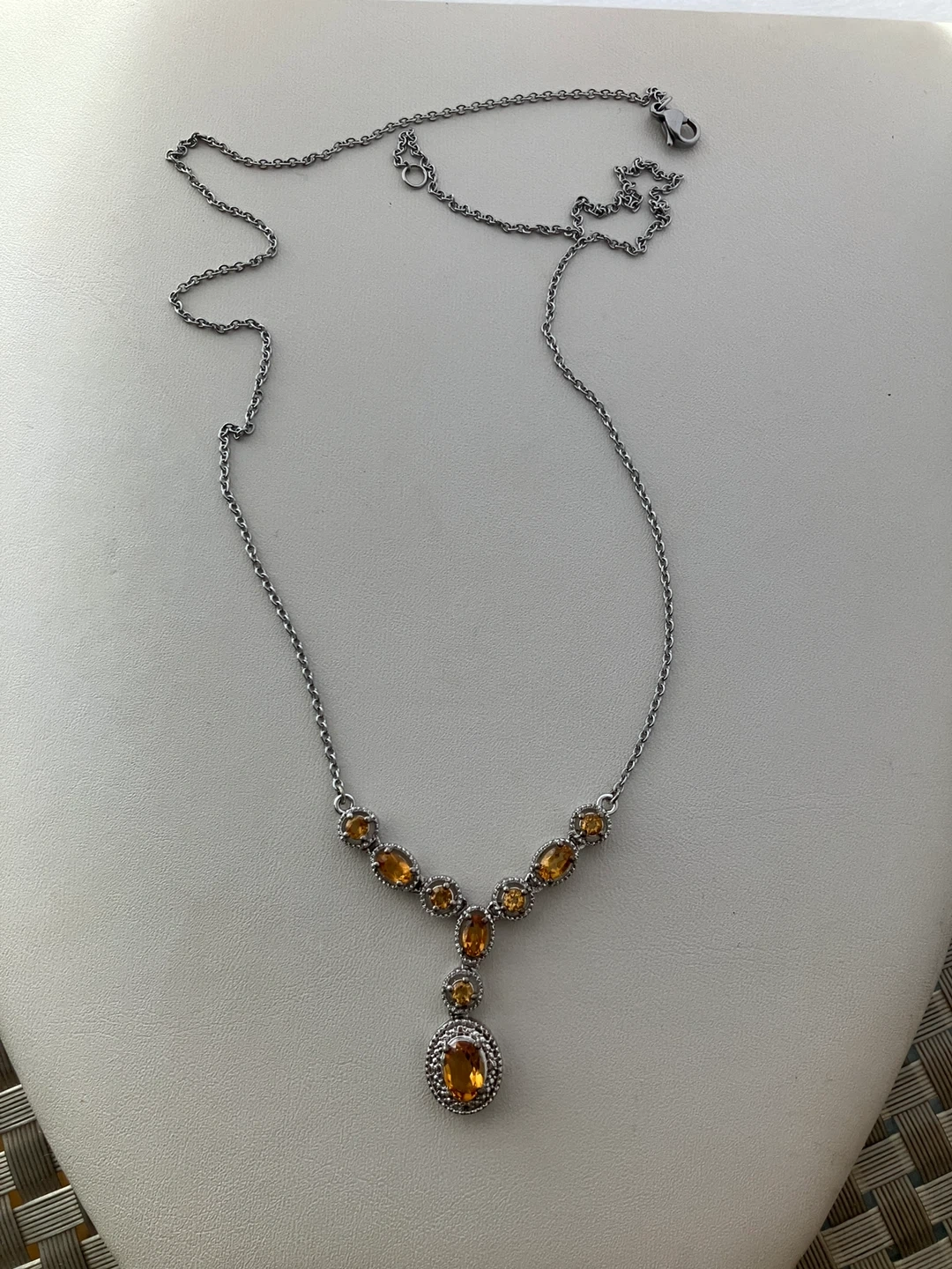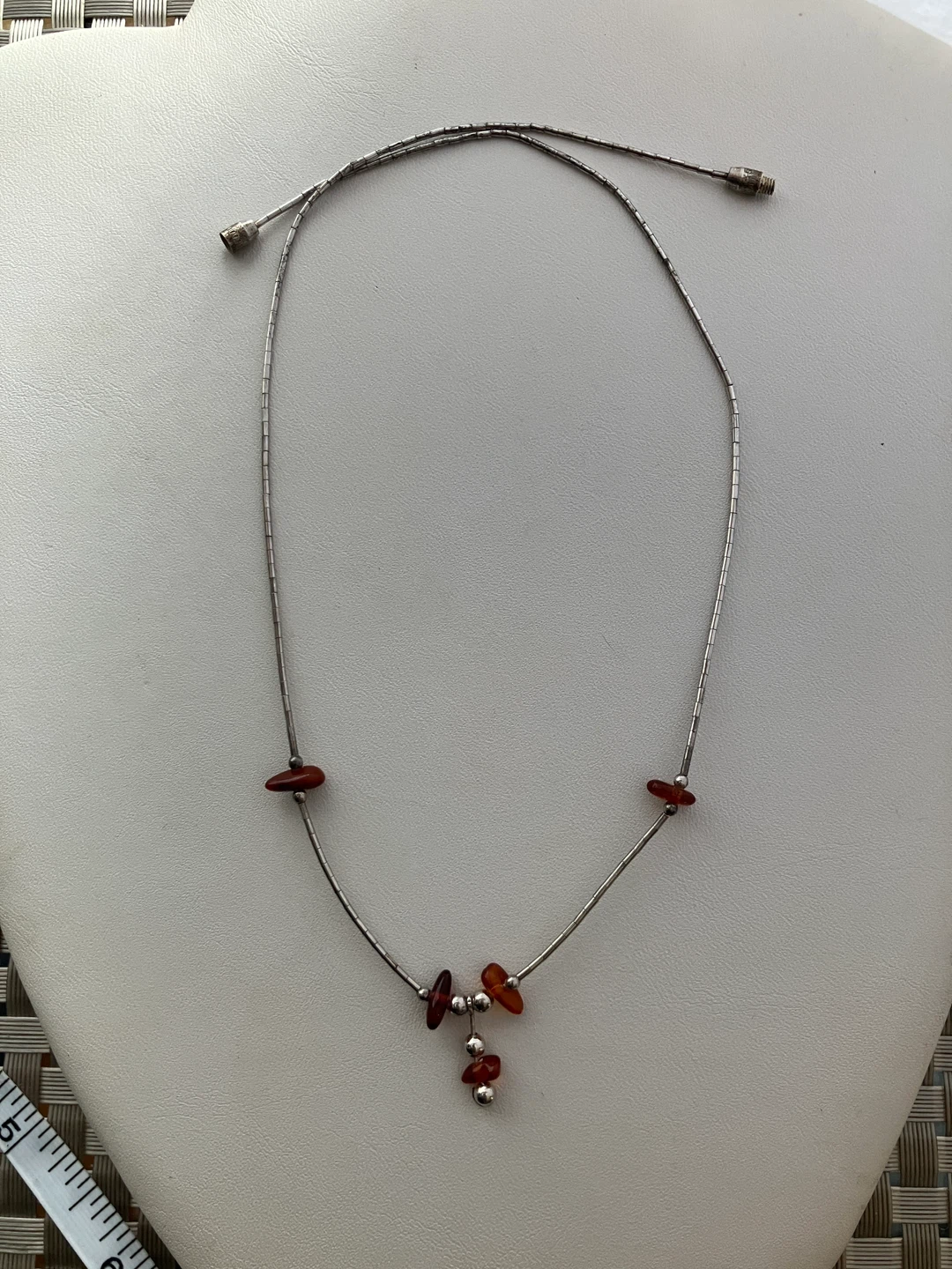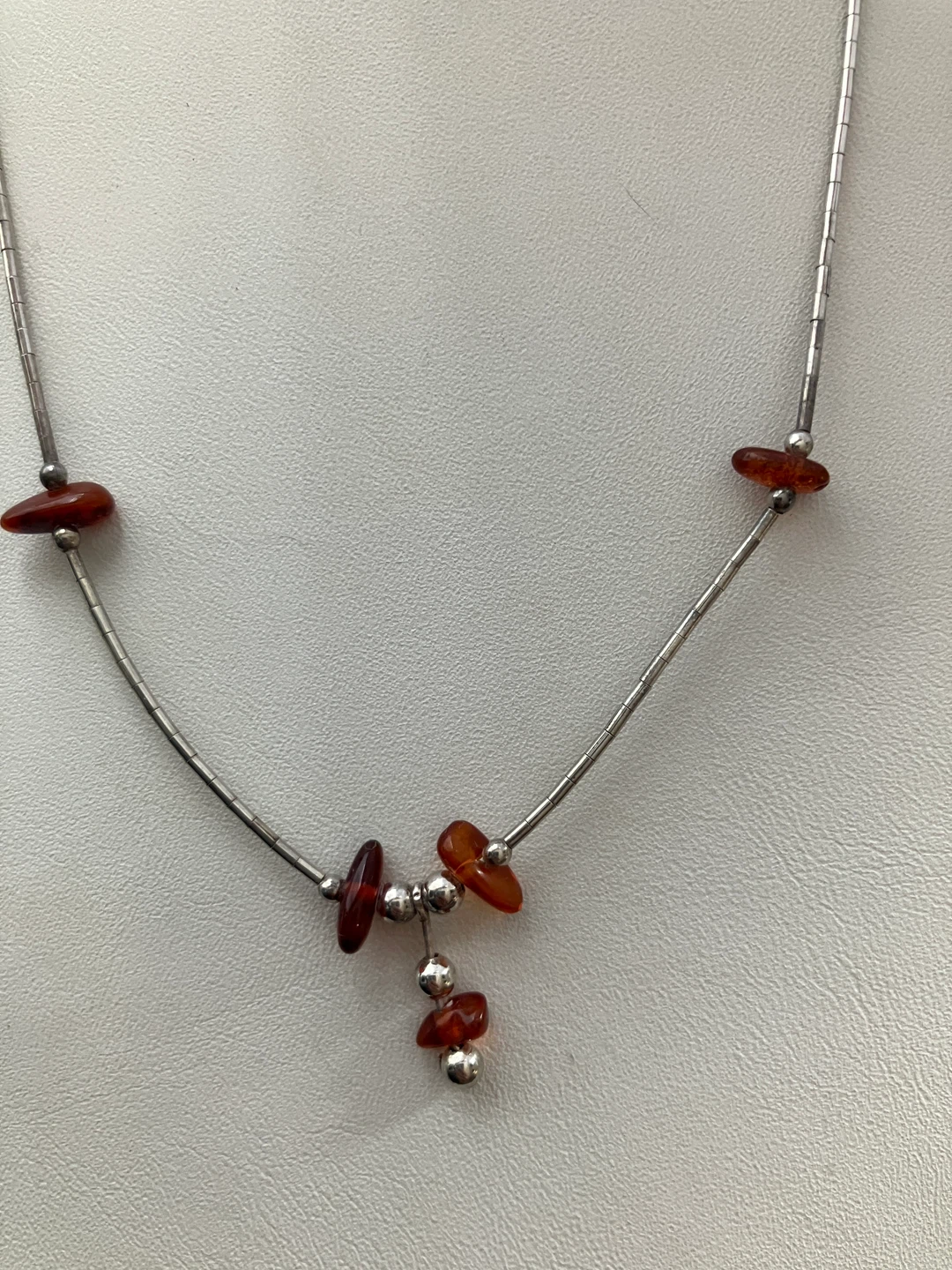 A lovely liquid silver necklace featuring amber stones. It's in great condition and ready to add a touch of elegance to your outfit
