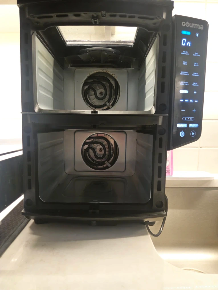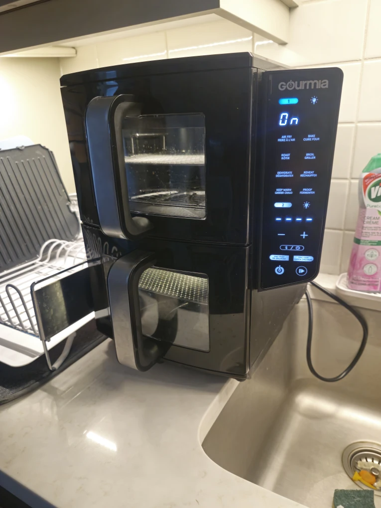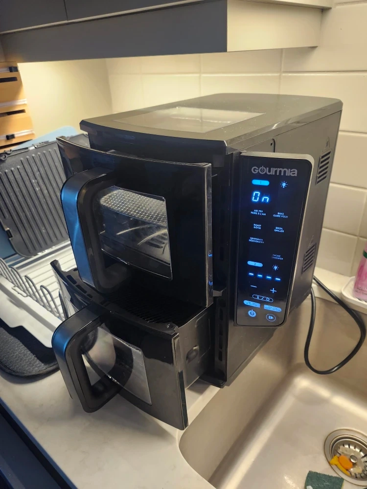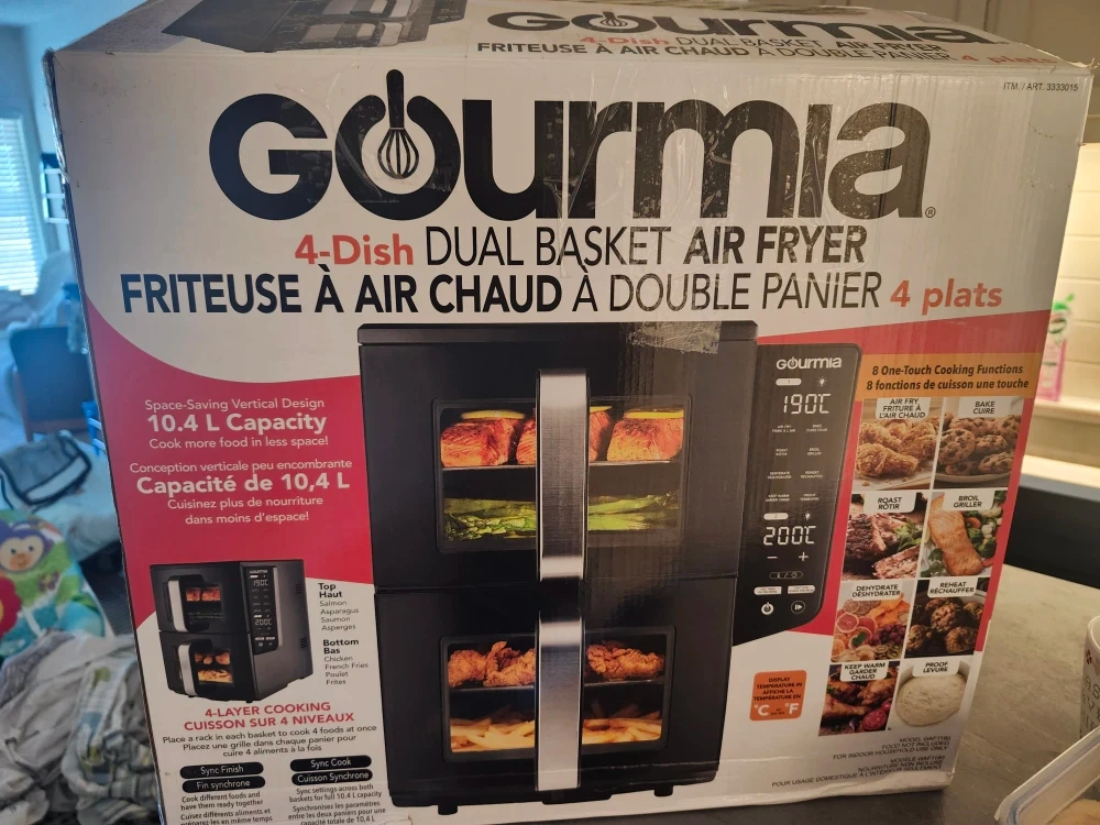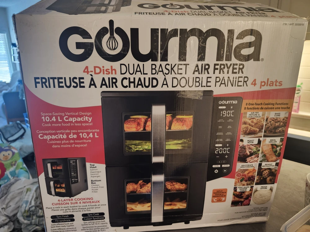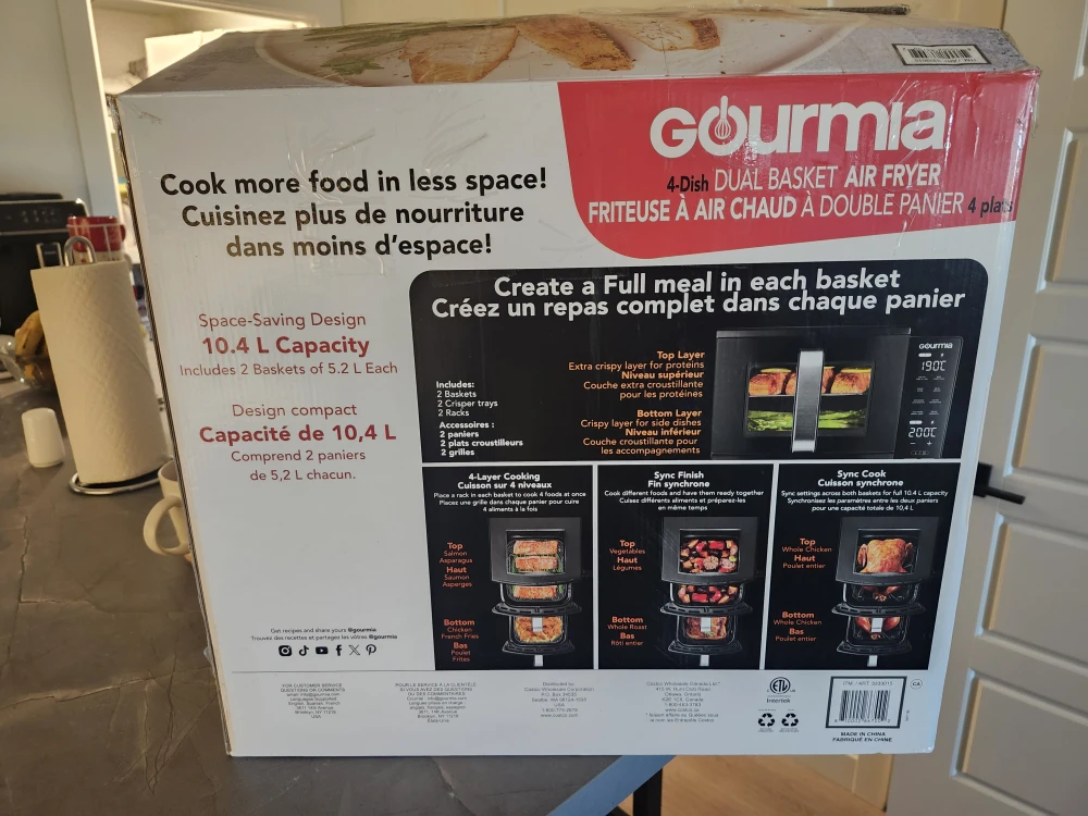 Selling a Gourmia 4-Dish Dual Basket Air Fryer with a 10.4L capacity! It's designed to cook more food in less space. This air fryer includes 2 baskets of 5.2L each, 2 trays, and 2 racks. Box included