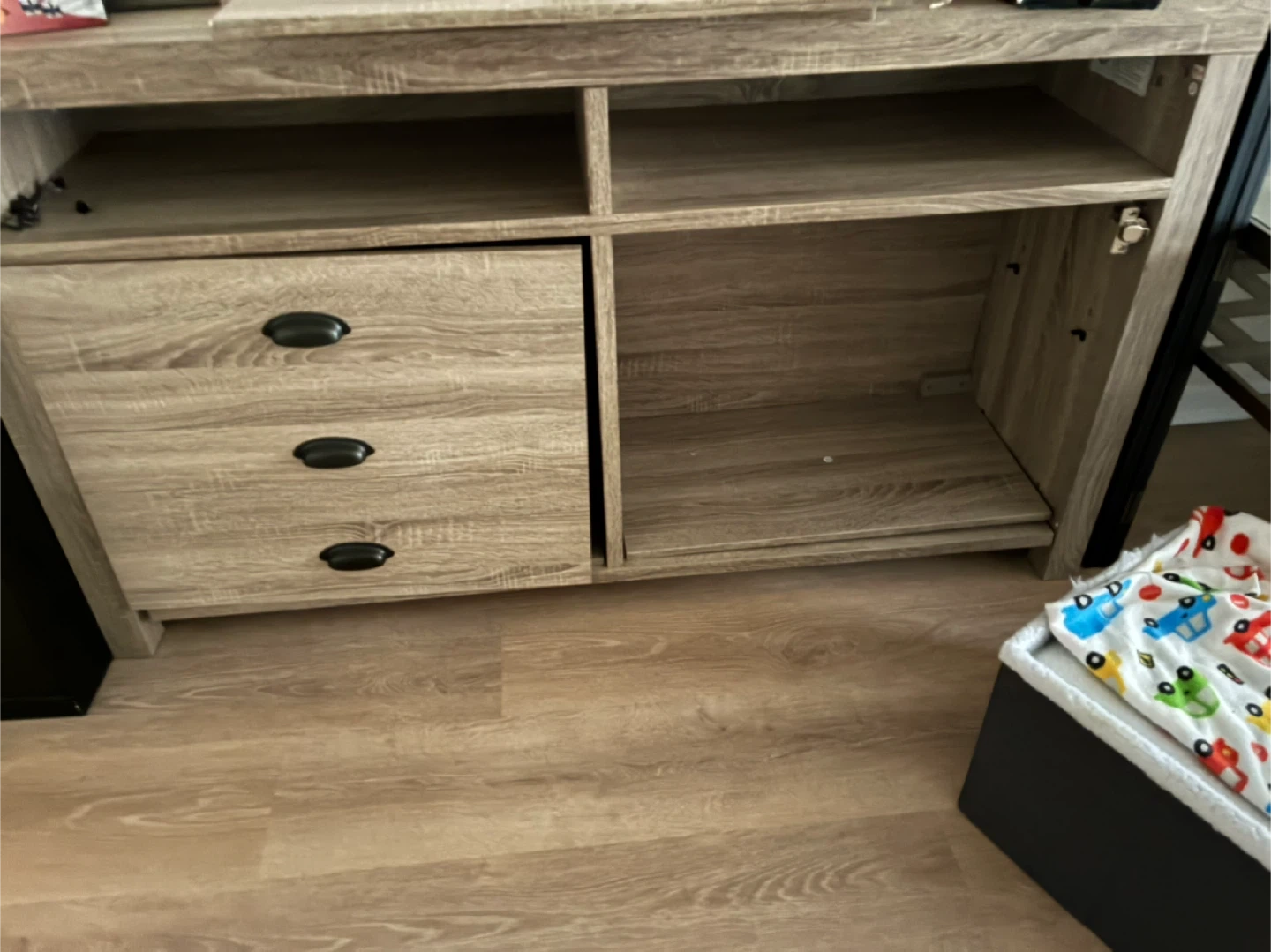 Selling a wooden TV stand with a drawer and open shelving. It's in good condition and offers plenty of space for your media devices and accessories. Great for organizing your living room!
