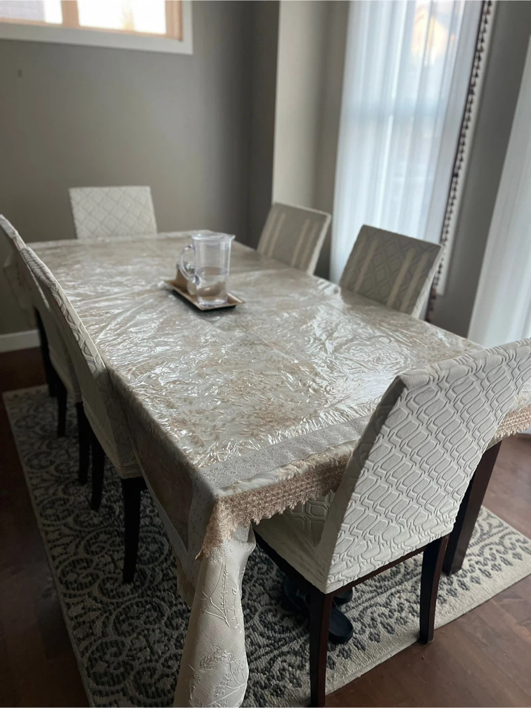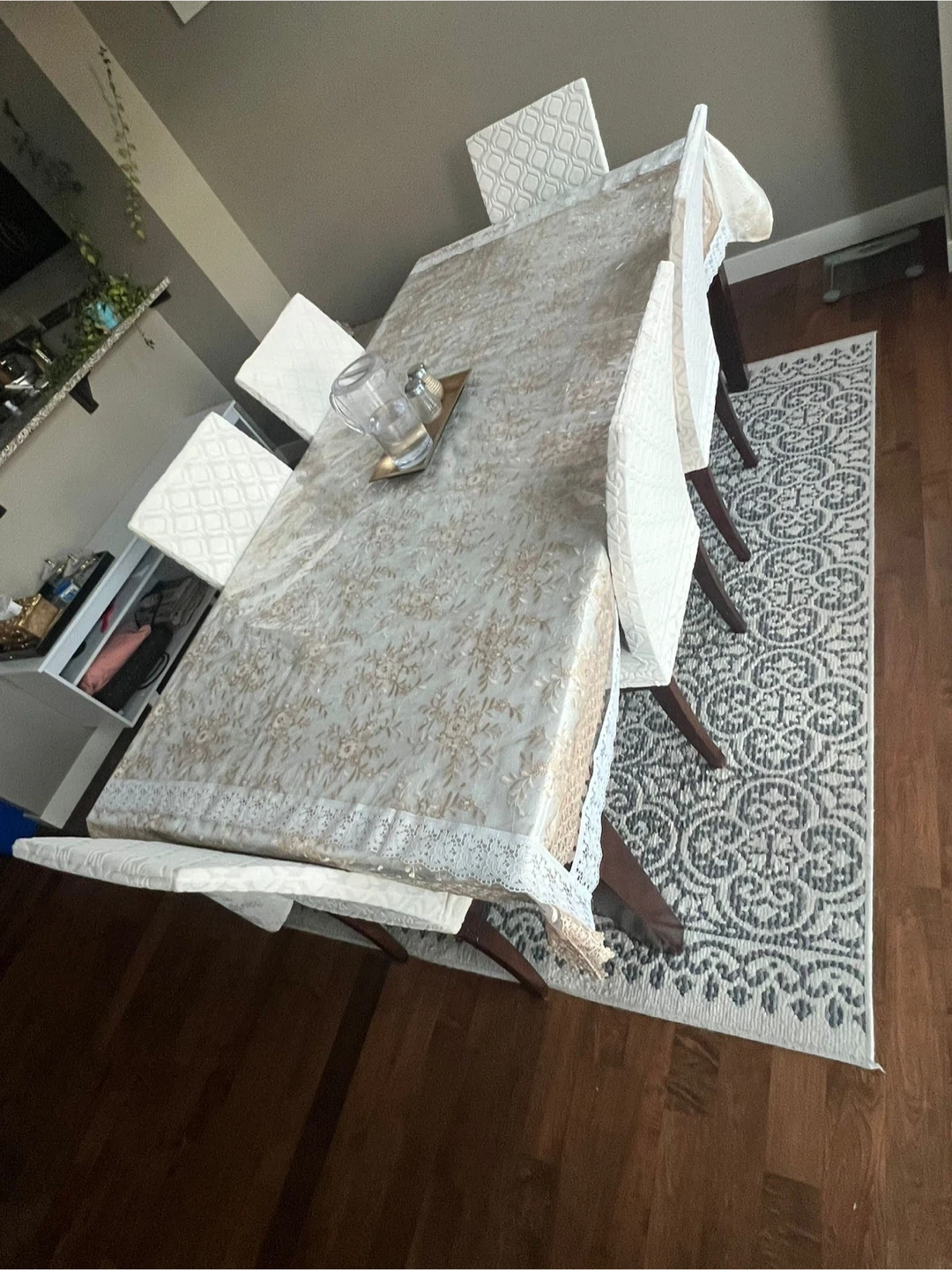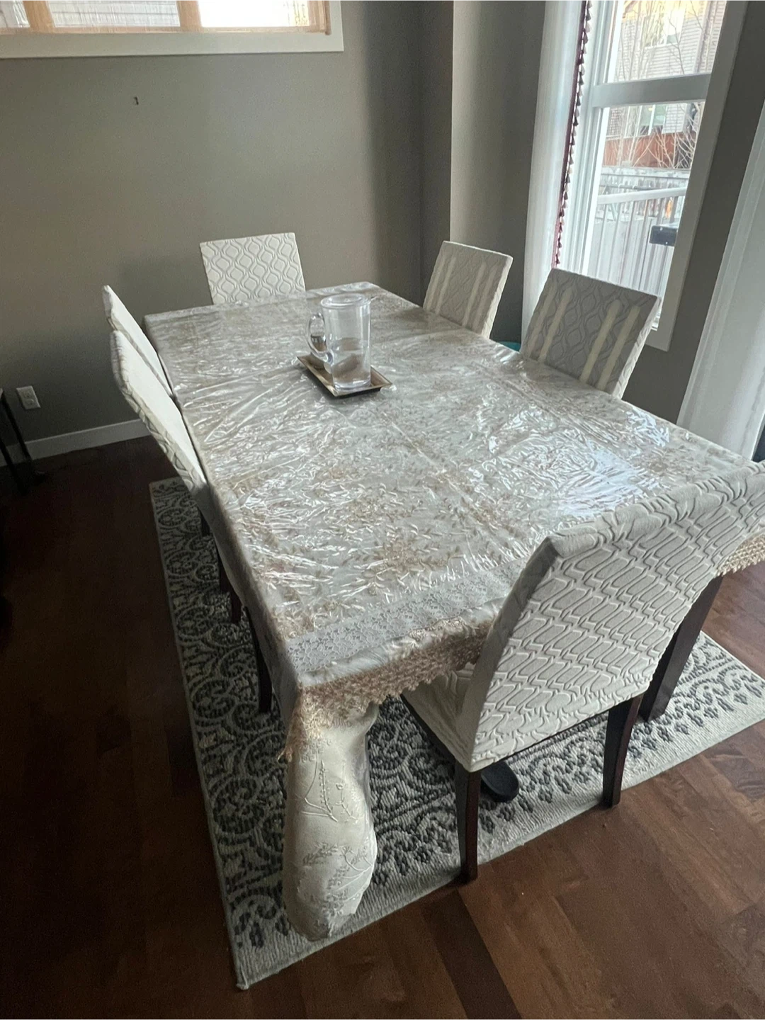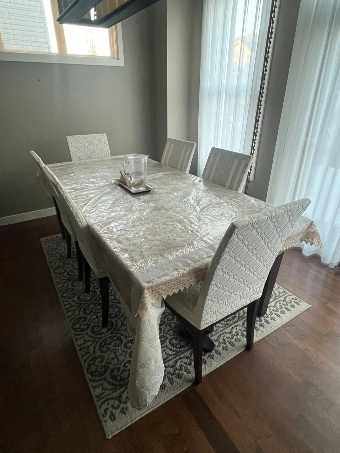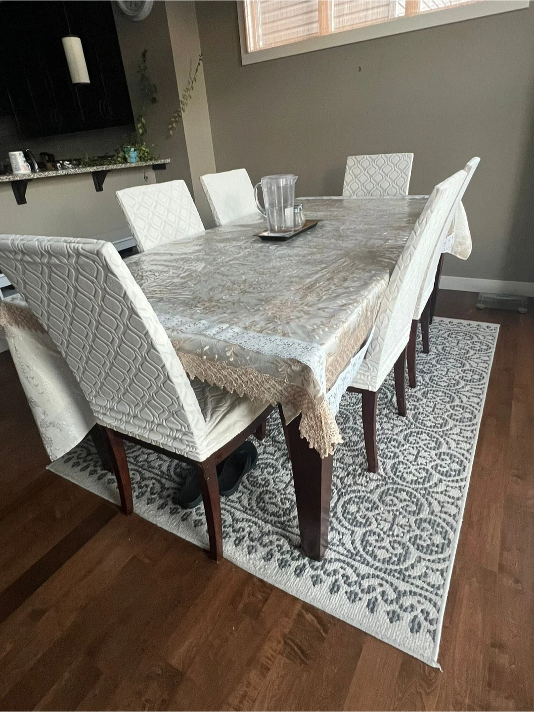 Selling a dining table with six chairs and adjustable table to adjust size based on requirement and space. The set is in good condition and ready for a new home. Perfect for family meals or gatherings!