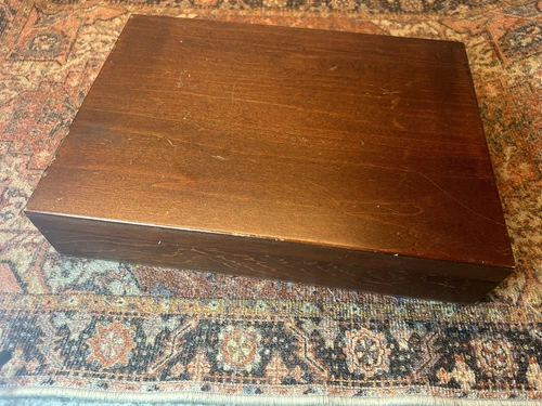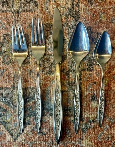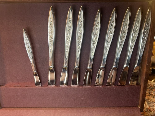 Five piece place settings for 8 people, including fork, salad fork, place spoon, teaspoon and knife. This 49 piece set also features a complete array of serving pieces, including: ladle, casserole spoon, serving spoon, slotted spoon, cold meat fork, master butter knife, butter knife, and pie server. Created in 1967, this set is in great shape for its 57 years, estate condition, only minor scratches from normal use. The dark stained wooden box with tarnish-proof fabric lining as well as an original advertising brosure and Rogers Bros. Guarantee are also included in the sale.